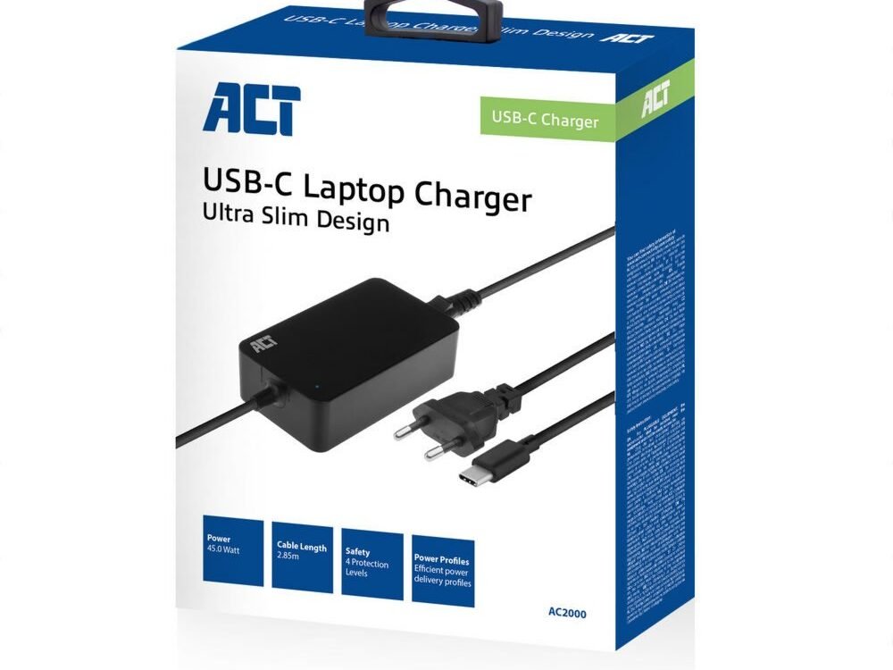 De AC2000 USB-C Laptoplader 45W is de perfecte accessoire voor je laptop met USB-C-laadpoort. De laptop wordt altijd opgeladen met de juiste hoeveelheid stroom dankzij de vooringestelde Power Delivery-profielen. De lader communiceert met de laptop voor het beste laadprofiel. Heb je een smartphone/tablet met USB-C? Dan laadt de AC2000 deze ook op.
