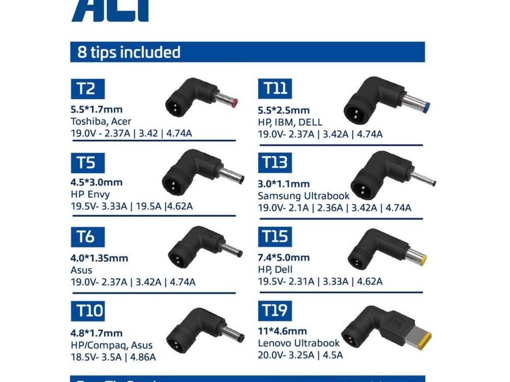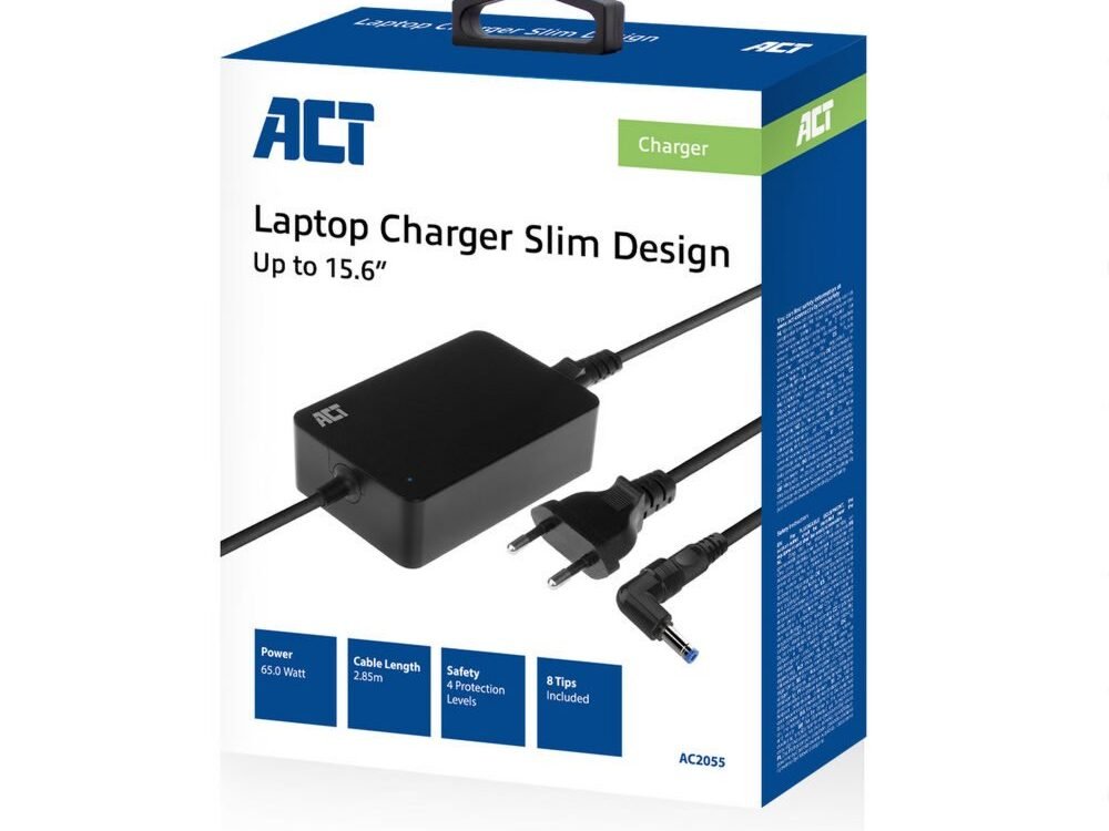 Ben je de lader van je laptop kwijt of wil je gewoon een reservelader hebben? De 65W AC2055 Compacte laptoplader is geschikt voor laptops tot 15,6 inch. Dankzij het zeer compacte formaat neem je de lader gemakkelijk overal mee naartoe. De extra lange kabel van 3m zorgt voor meer bewegingsvrijheid. De lader stopt met laden wanneer de batterij van de laptop vol is. Er worden 8 plugjes meegeleverd voor de meest gebruikte laptops.