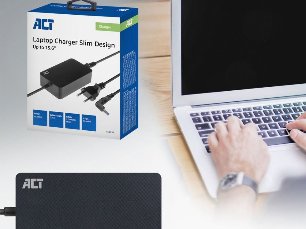 Gebruik de AC2055 als een nieuwe of extra lader voor je laptop van 15,6”. Deze compacte lader laadt je laptop op met maximaal 65W.