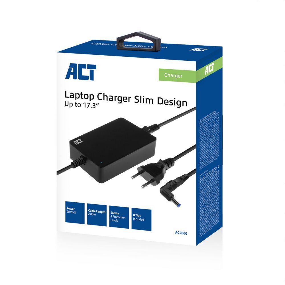 Is de lader van je laptop kwijt of wil je gewoon een reservelader hebben? De 90W AC2060 Compacte laptoplader is geschikt voor laptops tot 17,3 inch. Dankzij het zeer compacte formaat neem je de lader gemakkelijk overal mee naartoe. De extra lange kabel van 2,85 meter zorgt voor meer bewegingsvrijheid. De lader stopt met laden wanneer de batterij van de laptop vol is. Er worden 8 plugjes meegeleverd voor de meest gebruikte laptops. Deze compacte lader laadt je laptop met maximaal 90W op.