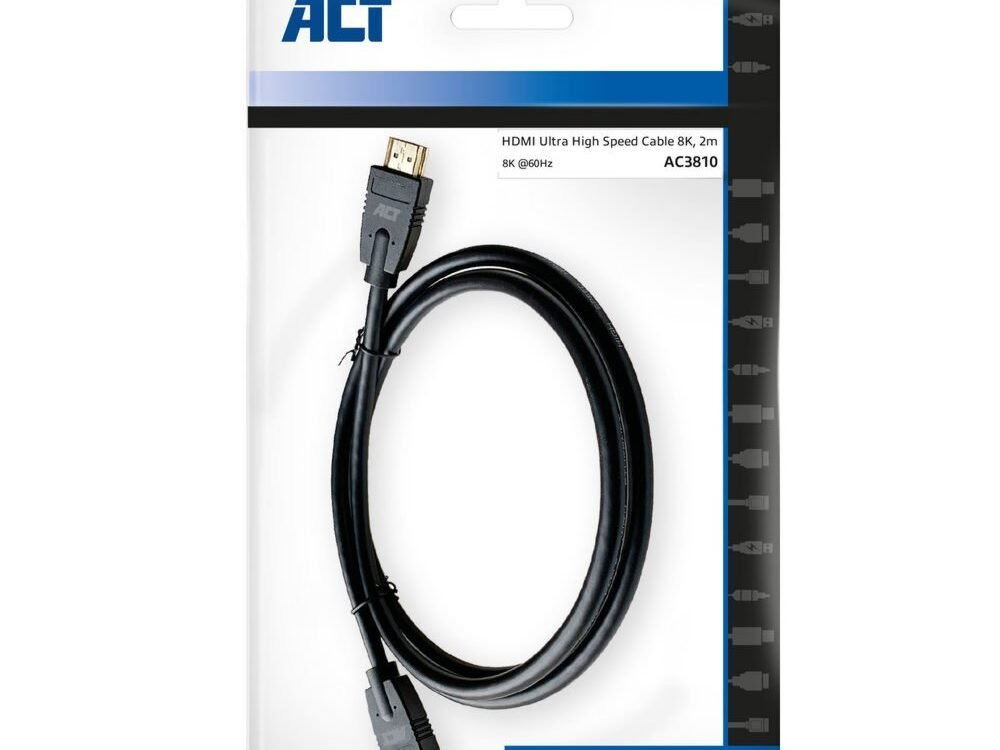 De ACT AC3810 HDMI kabel 8K verbindt een laptop met een HDMI-output met een monitor of beamer met HDMI-input. De kabel heeft een lengte van 2m. De maximale resolutie is 7680 x 4320 (8K) @ 60Hz en 3840 x 2160 (4K) @ 120Hz.