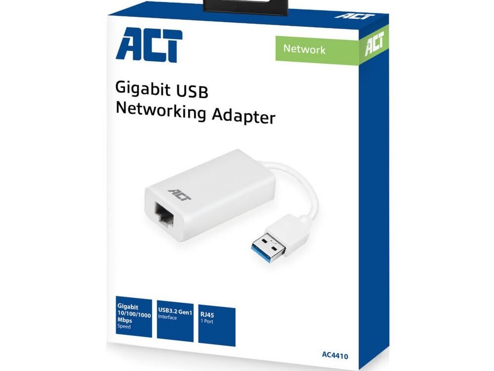Heb je geen netwerkaansluiting op je computer? Is de netwerkpoort van de desktop of laptop defect? Gebruik de ACT AC4410 USB 3.2 Gen1 Gigabit Netwerkadapter om weer online te komen. Upgrade het bestaande netwerk naar een Gigabit netwerk via de USB 3.2 Gen1 poort. De adapter is eenvoudig te installeren op alle gangbare besturingssystemen.