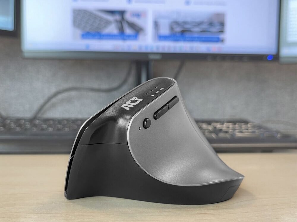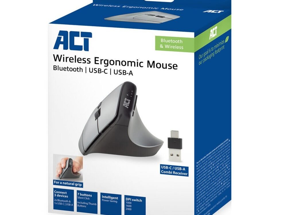 Voorkom muis-gerelateerde klachten met de ACT AC5155 Draadloze Ergonomische Muis. Sluit deze muis tegelijkertijd op drie verschillende apparaten aan via Bluetooth (2x) en de USB-C/USB-A combi-ontvanger (1x). De ontvanger is gemakkelijk op te bergen in de muis zelf. Kies de gewenste nauwkeurigheid met de DPI-switch: 1000/1600/2400. De toegankelijke duimknoppen zorgen voor een snelle navigatie door webpagina’s. Verder heeft de muis een intelligente energiebesparingsfunctie en een aan/uit-schakelaar.