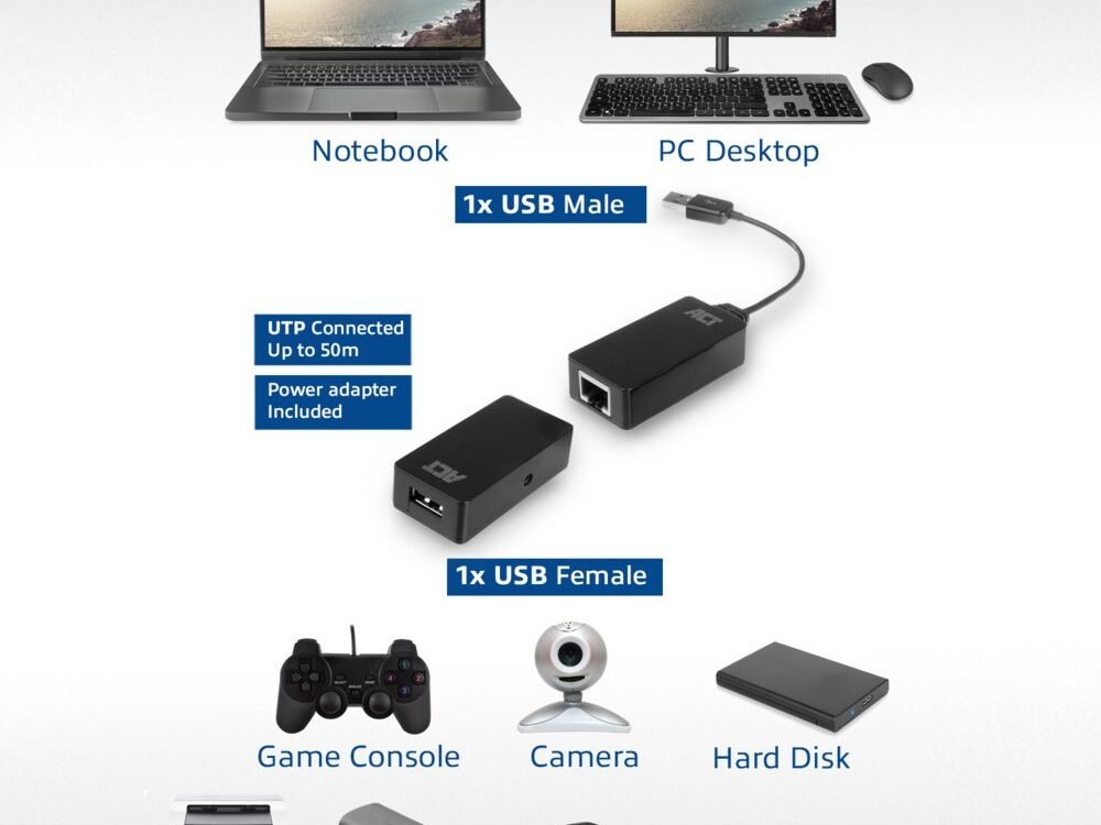 De AC6063 USB 2.0 Extender set via UTP stelt je in staat om je USB-apparatuur eenvoudig uit te breiden over een afstand van 50 meter. Verbind computerperipherals zoals: een webcam, printer, harde schijf, toetsenbord of muis over een grotere afstand. De extender set bevat een zenderunit, een ontvangerunit en een voedingsadapter.