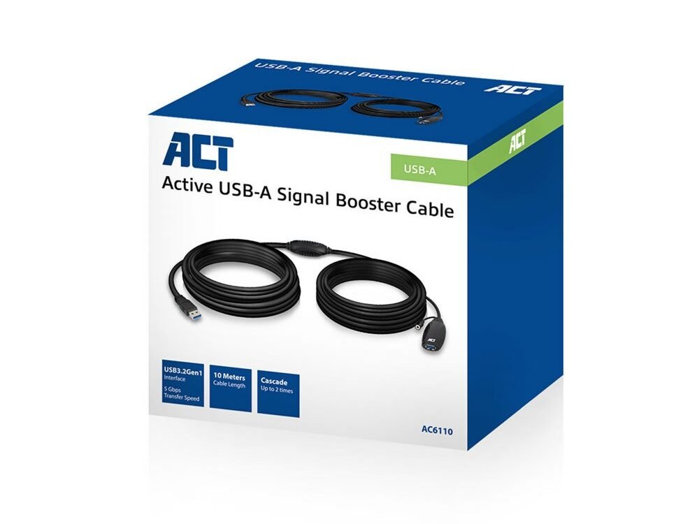 Is de USB-kabel te kort? Verleng dan het USB-signaal met 10 meter door gebruik te maken van de AC6110 Actieve USB Signaalversterker. Deze kabel gebruik je om randapparatuur zoals: een webcam, printer, harde schijf, toetsenbord en muis over een langere afstand aan te sluiten. De AC6110 kan tot 2 keer gekoppeld worden en is overeenkomstig met USB 3.2 Gen1 (USB 3.0) specificaties. De boosterkabel heeft een DC input voor het optioneel aansluiten van een 5V-stroomadapter.