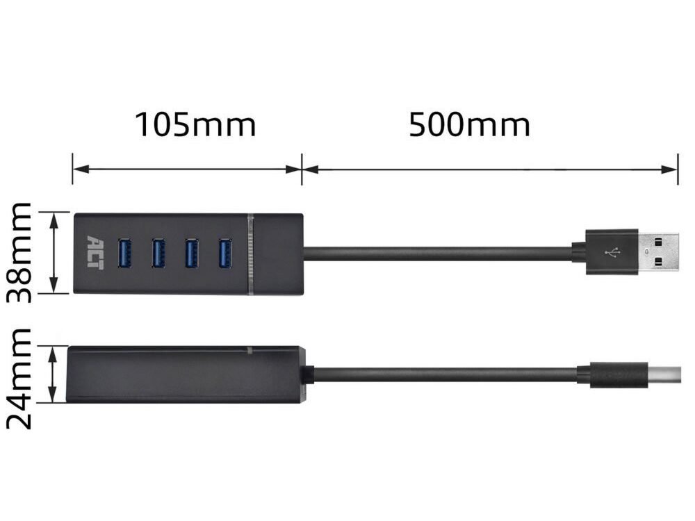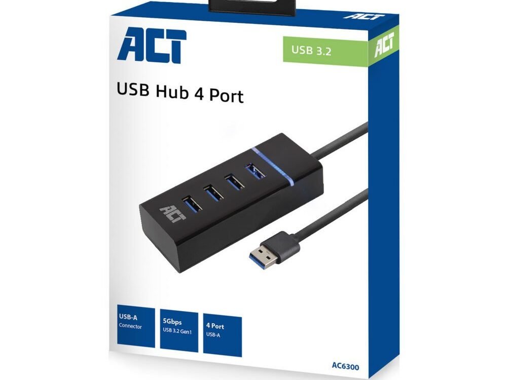 De ACT AC6300 ondersteunt de USB 3.2-standaard waarmee je profiteert van een maximale snelheid tot 5Gbps. Sluit de hub aan op een laptop of computer met de vaste, 50 centimeter lange, USB 3.2 kabel. De AC6300 4-poorts Hub is backwards compatibel met USB 3.1, USB 2.0 en USB 1.1.