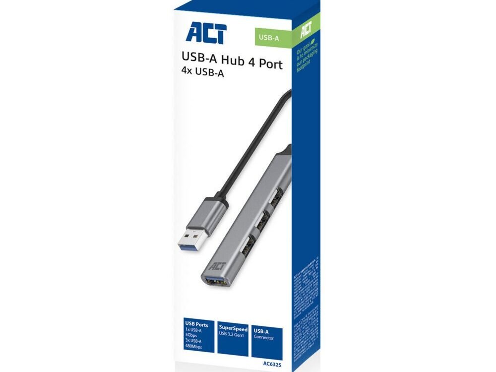 De ACT AC6325 USB-A hub voegt 4 USB-A poorten toe aan je laptop of computer. De compacte en lichtgewicht aluminium hub heeft één USB 3.0 5Gbps poort en drie USB 2.0 480Mbps poorten.