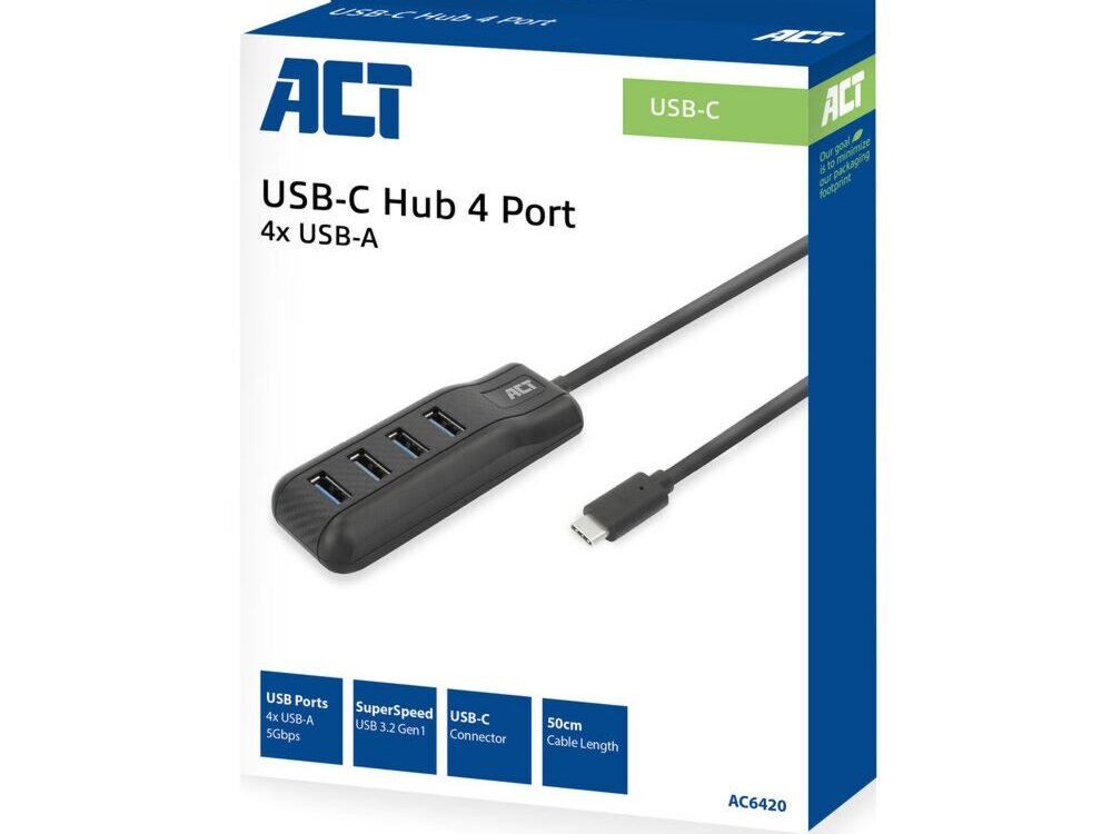 De ACT AC6420 USB-C Hub voegt 4 USB-A poorten toe aan je laptop of computer met USB-C. De hub is compatibel met de USB 3.2 Gen1 standaard, ook wel USB 3.0 genoemd, met een overdrachtssnelheid van SuperSpeed USB 5Gbps. Door de handige kabel van 50cm bungelt de hub niet aan je laptop wanneer deze op een standaard staat of op een bureau is geplaatst.
