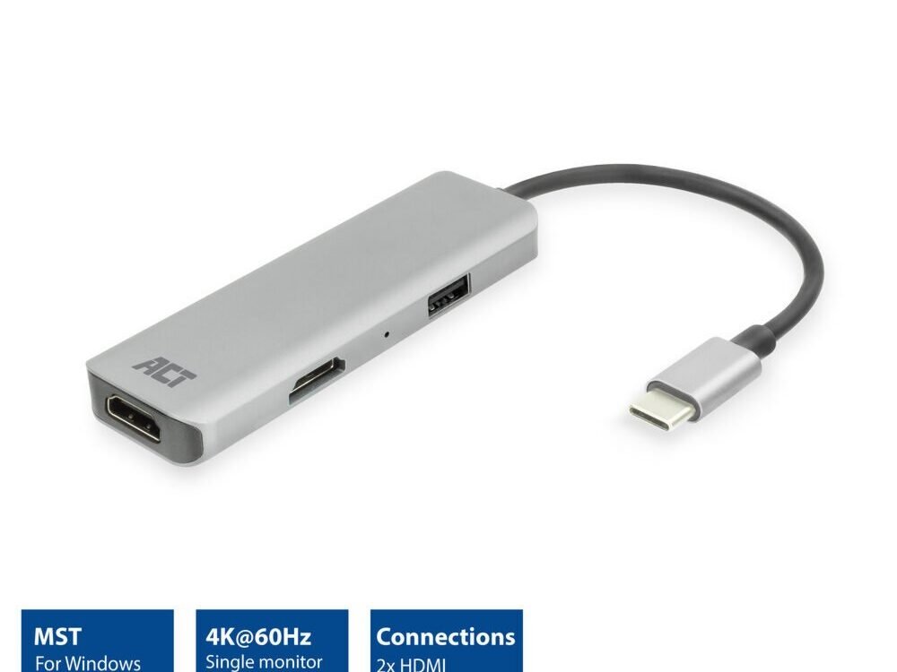 Breid je display uit naar twee extra HDMI monitoren met de AC7013 USB-C 4K multiport adapter met MST ondersteuning. Met deze adapter kloon je of breid je de desktop uit met 2 extra HDMI monitoren. De multiport adapter wordt via USB gevoed en voegt een USB-A datapoort toe aan je device.