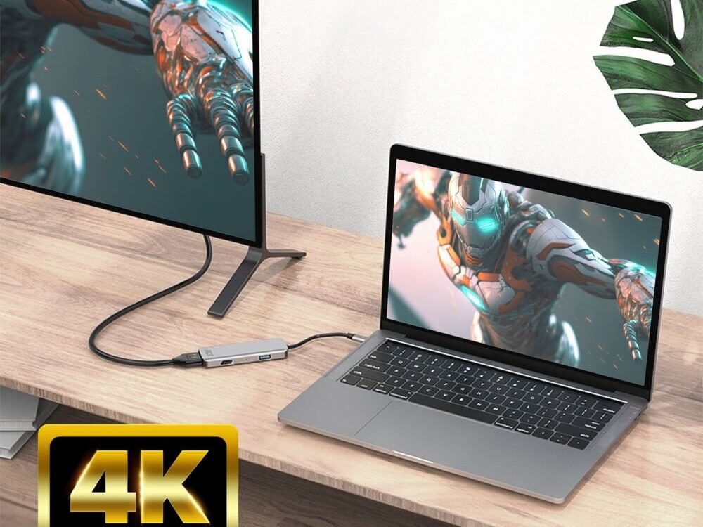 Deze stevige aluminium adapter wordt gevoed via USB. Er is geen externe voeding nodig. Zorg ervoor dat de USB-C poort van de notebook DP Alt Mode ondersteunt.