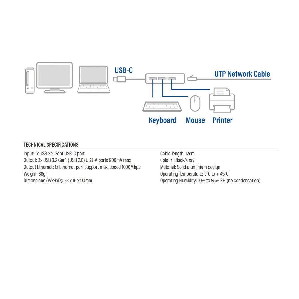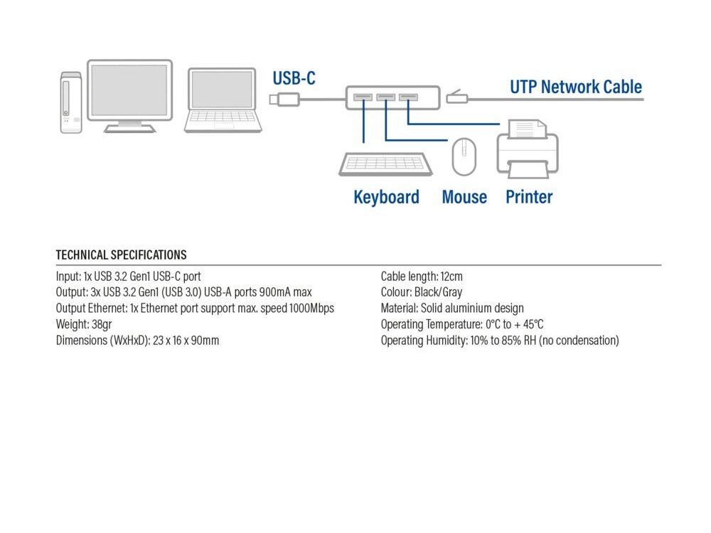 Sluit 3 USB-A apparaten aan op je laptop met USB-C met de stevige aluminium AC7055 3-Poorts USB-C (Superspeed) Hub. De AC7055 heeft een Gigabit ethernet poort zodat eenvoudig een fysieke internet/netwerkverbinding op jouw notebook/ultrabook kunt aansluiten. De hub is direct klaar voor gebruik. Er is geen externe voeding nodig.