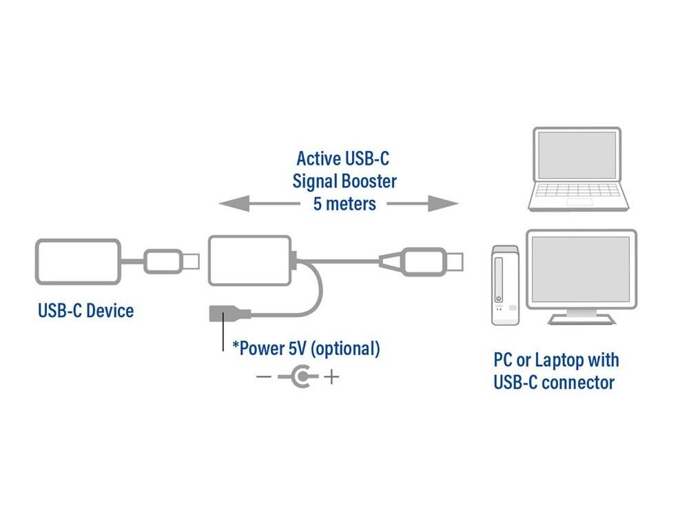 Verleng de USB-C datakabel met een afstand van 5 meter door gebruik te maken van de AC7060 USB-C-Signaalversterker. Deze kabel gebruik je om computerrandapparatuur over een langere afstand aan te sluiten. Cascadeer de AC7060 tot 15 meter. De signaalbooster is overeenkomstig met USB 3.2 Gen1. In sommige gevallen is de afstand die moet worden verlengd te groot. Daarom heeft de boosterkabel een DC-input voor het optioneel aansluiten van een 5V-stroomadapter (AC1505 wordt apart verkocht).