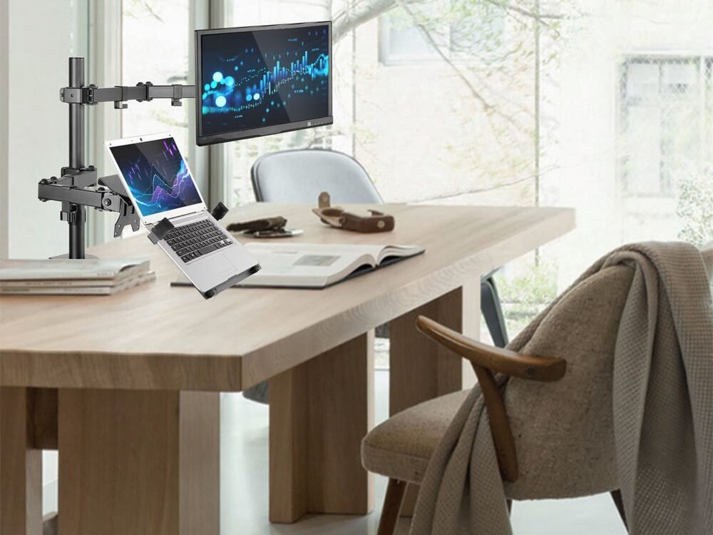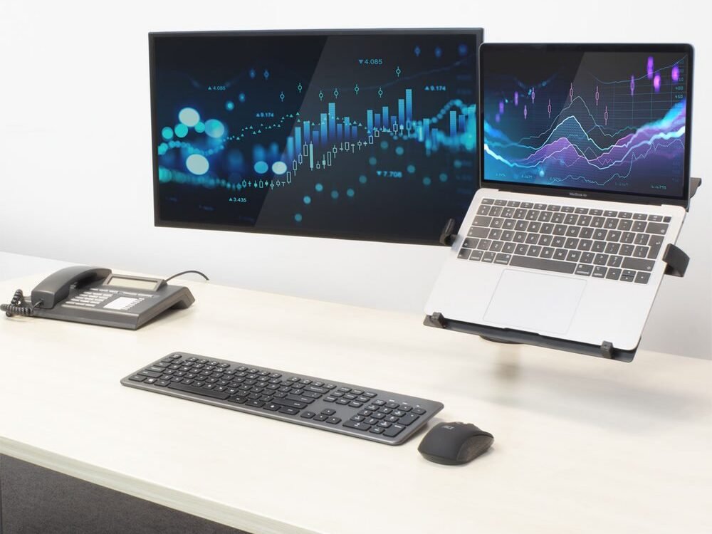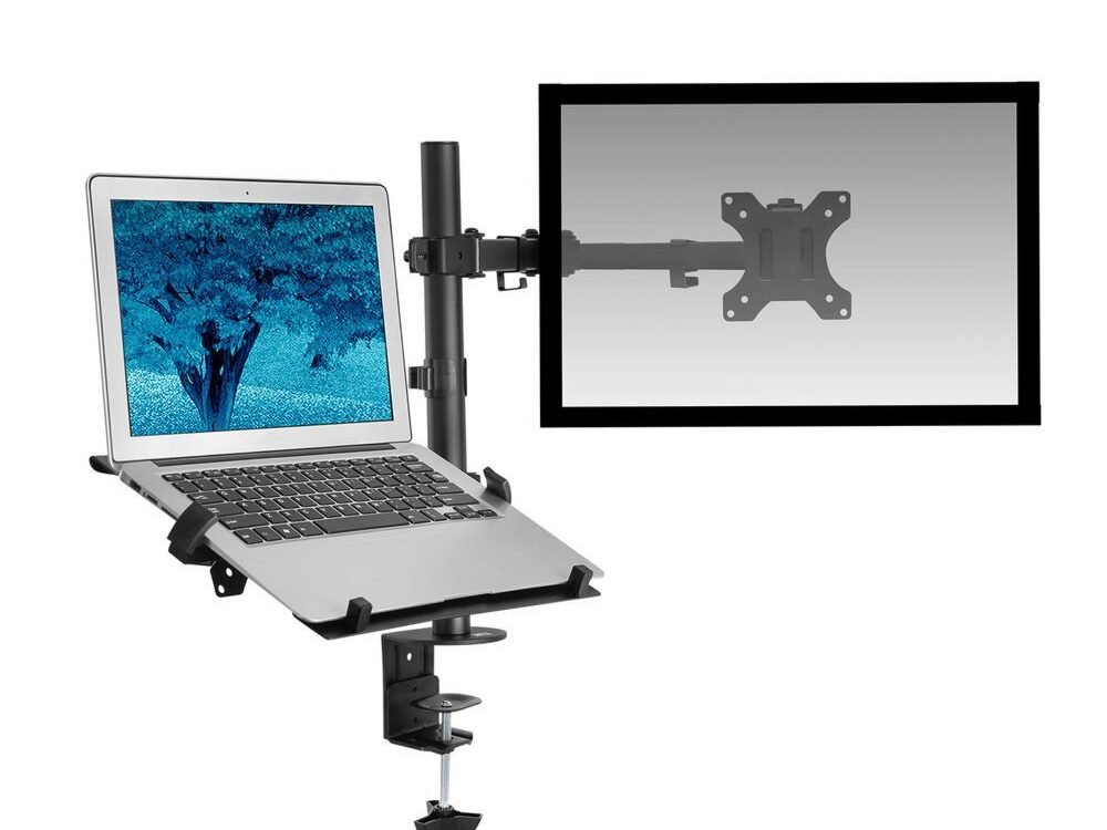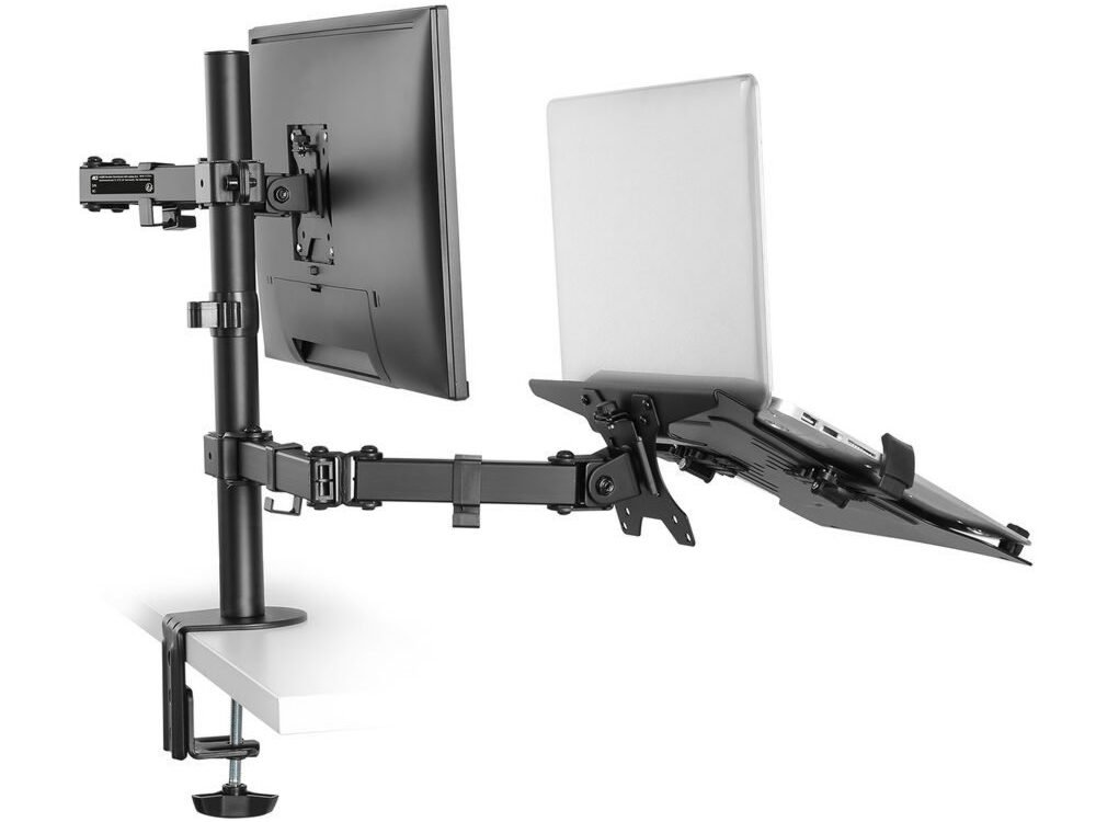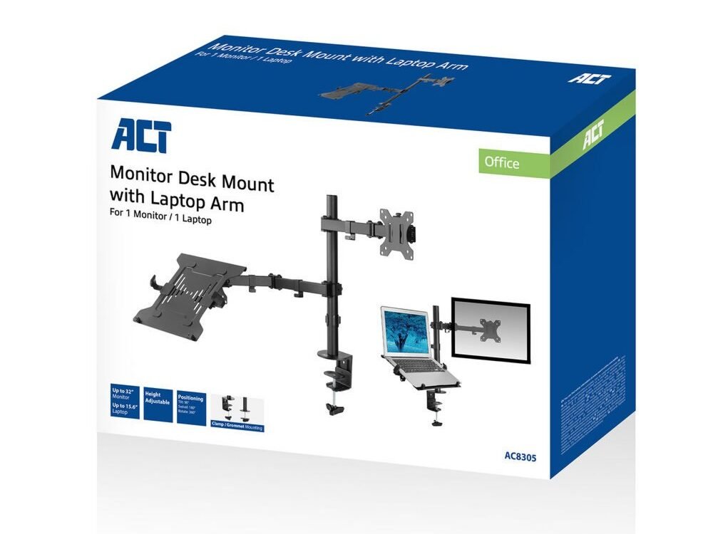 De AC8305 Monitor Bureausteun met laptoparm creëert een ergonomische en plaats besparende werkplek. Bevestig de monitorsteun op of door een bureau (max. tafeldikte 88mm). Plaats eenvoudig een scherm tot 32” en 8kg op de AC8305 met het beeldschermmontagesysteem. De arm met daaraan de laptopsteun is geschikt voor een laptop tot 15,6” en 4kg. De steun heeft drie knikpunten voor het instellen van de ideale kijkafstand. De monitor en de laptop zijn op de gewenste kijkhoek te plaatsen door deze te kantelen, te roteren of te zwenken. De kabels kunnen worden weggewerkt met het kabelmanagementsysteem.