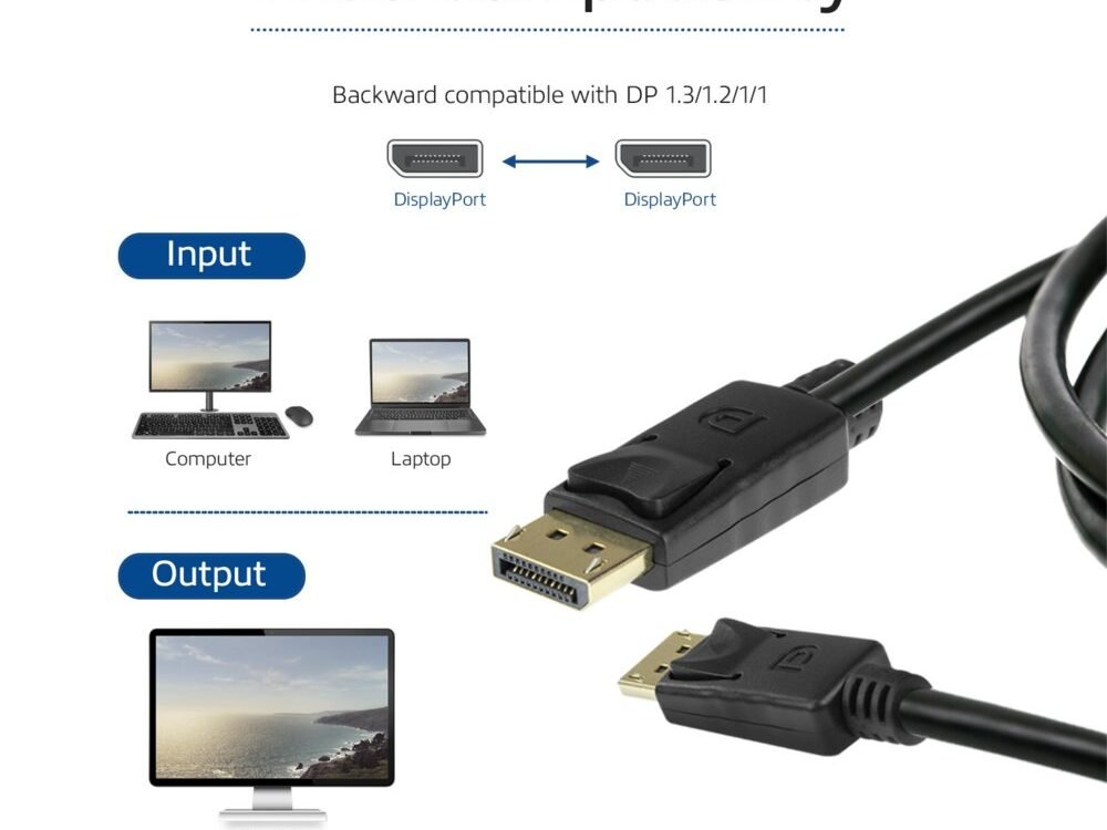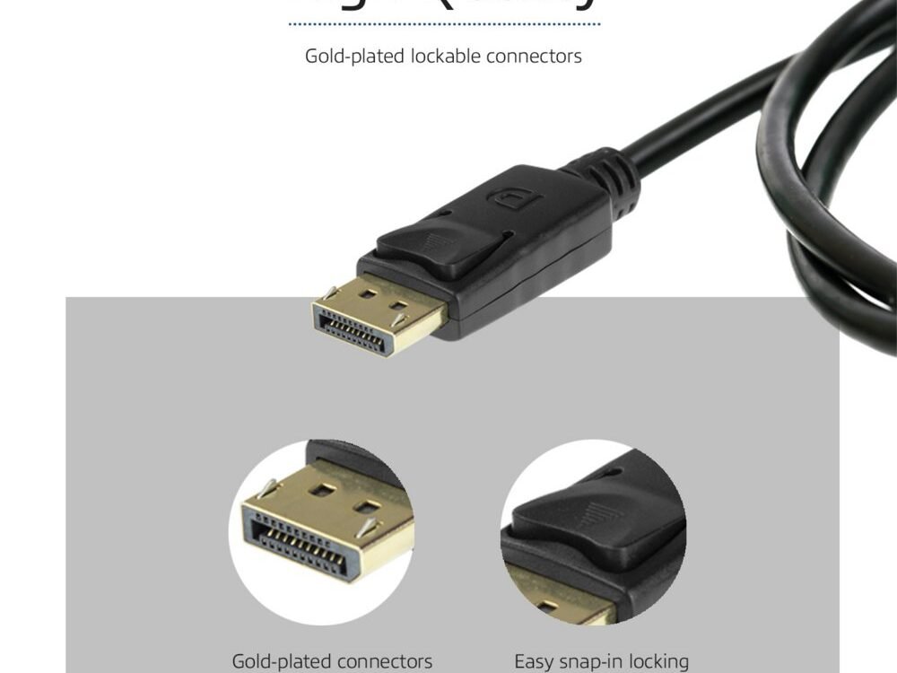 De DisplayPort-kabel ondersteunt Display Stream Compression (DSC) 1.2, Forward Error Correction en 32 Inline Audio Channels. De kabel heeft vergulde connectoren met snap-in vergrendeling.