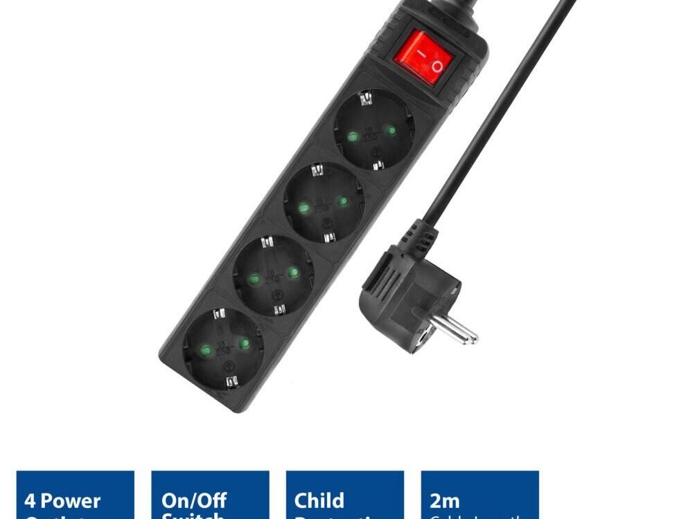 De AC2440 voorziet je apparaten van stroom. De stekkerdoos heeft 4 stopcontacten met een hoek van 45° en een extra lange kabel van 2m. Zet alle aangesloten apparaten tegelijk aan en uit met de lichtgevende schakelaar. De AC2440 is voorzien van kinderbeveiliging.
