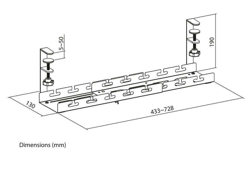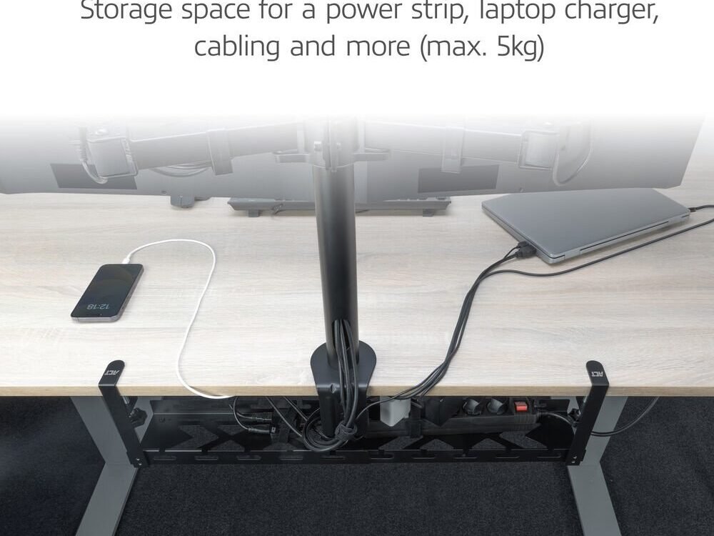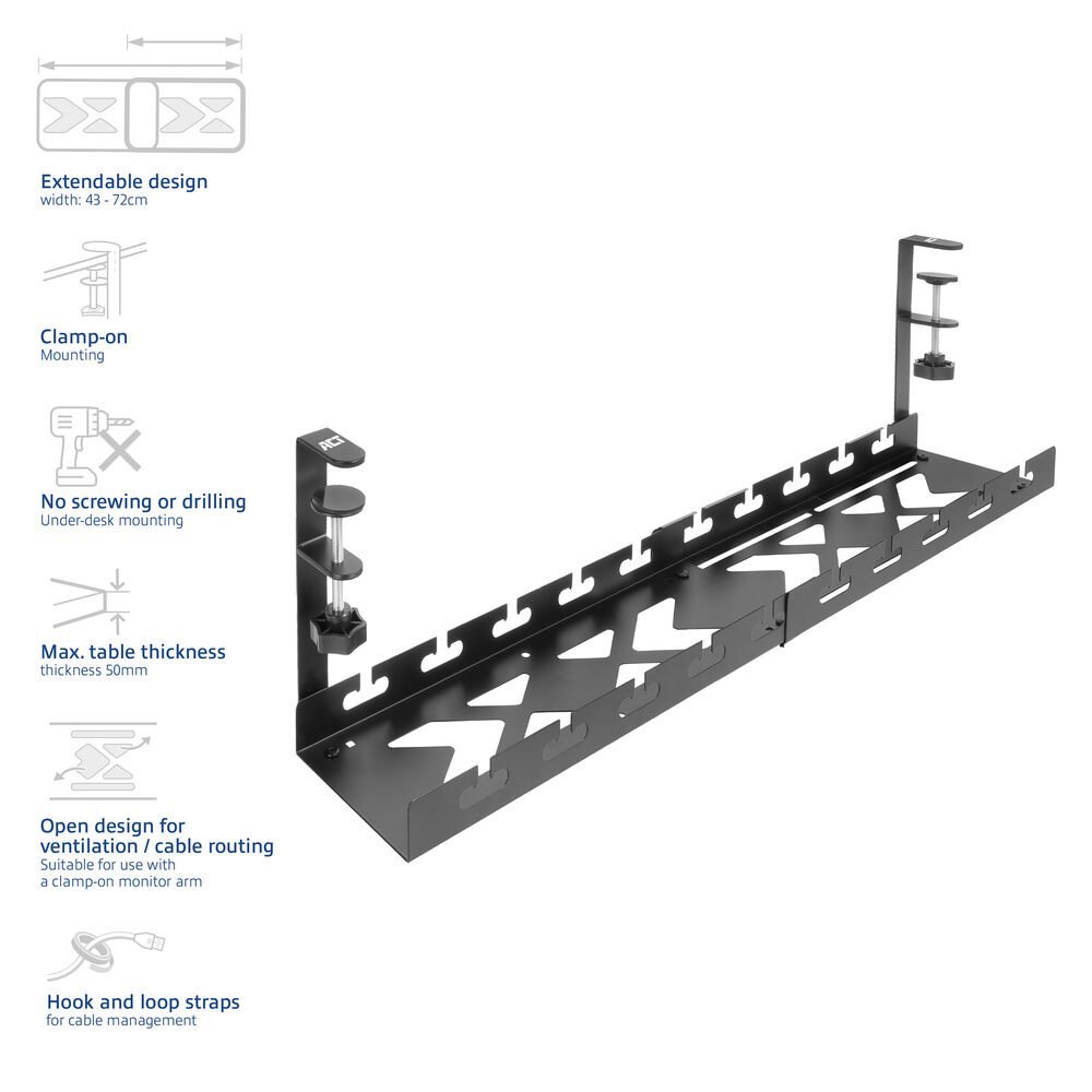 De metalen AC8379 kabelgoot zorgt voor het netjes en opgeruimd houden van een bureau en voor het ordenen van kabels. De kabelgoot is eenvoudig verstelbaar en aan te passen aan de gewenste breedte: 43 – 72 cm. Hierdoor is de AC8379 geschikt voor verschillende maten bureaus en biedt genoeg ruimte voor het opbergen van een stekkerdoos, laptoplader, kabels en meer. De kabelgoot heeft een open structuur voor betere ventilatie en kabelgeleidingen en is te monteren zonder te schroeven of het boren van gaten. Bevestig de goot onder een bureau (maximale tafeldikte 50mm) met het bijgeleverde klemsysteem. De AC8379 kan samen worden gebruikt met een monitorarm met klemmontage.