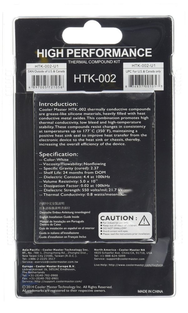 Cooler Master HTK-002 thermisch geleidende verbindingen zijn siliconenmaterialen met een vetachtige structuur, die zwaar zijn gevuld met warmtegeleidende metaaloxiden. Deze combinatie bevordert een hoge thermische geleidbaarheid, een lage lekkage en een hoge temperatuurstabiliteit. Deze verbindingen behouden hun consistentie bij temperaturen tot 177°C (350°F), wat zorgt voor een goede afdichting van de warmteafvoer om de warmteoverdracht van het elektronische apparaat naar de koellichaam of behuizing te verbeteren, waardoor de algehele efficiëntie van het apparaat wordt verhoogd.