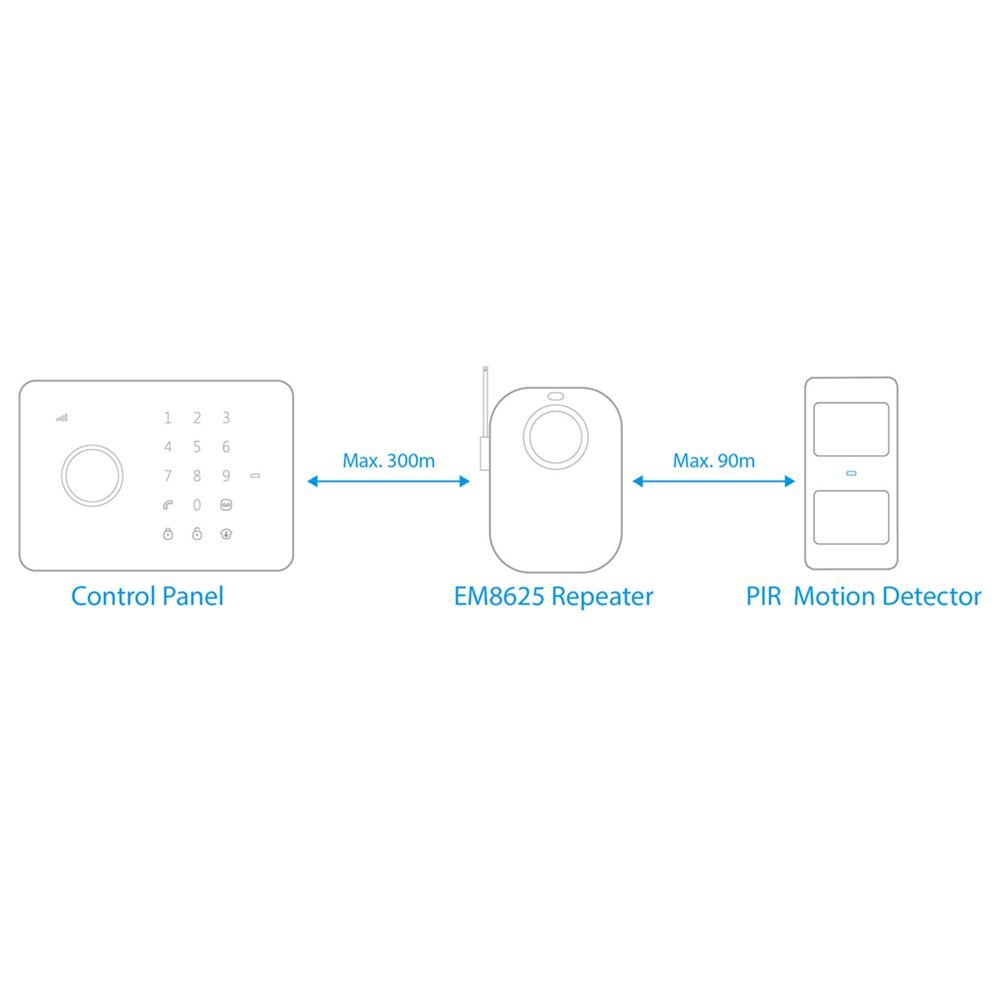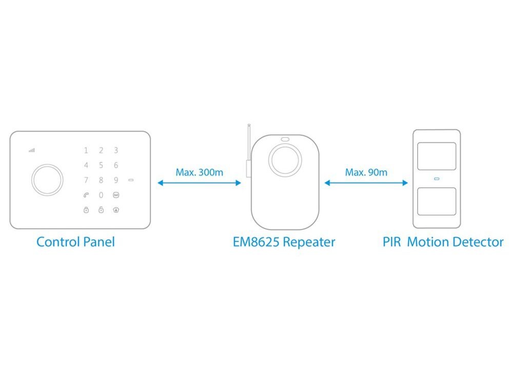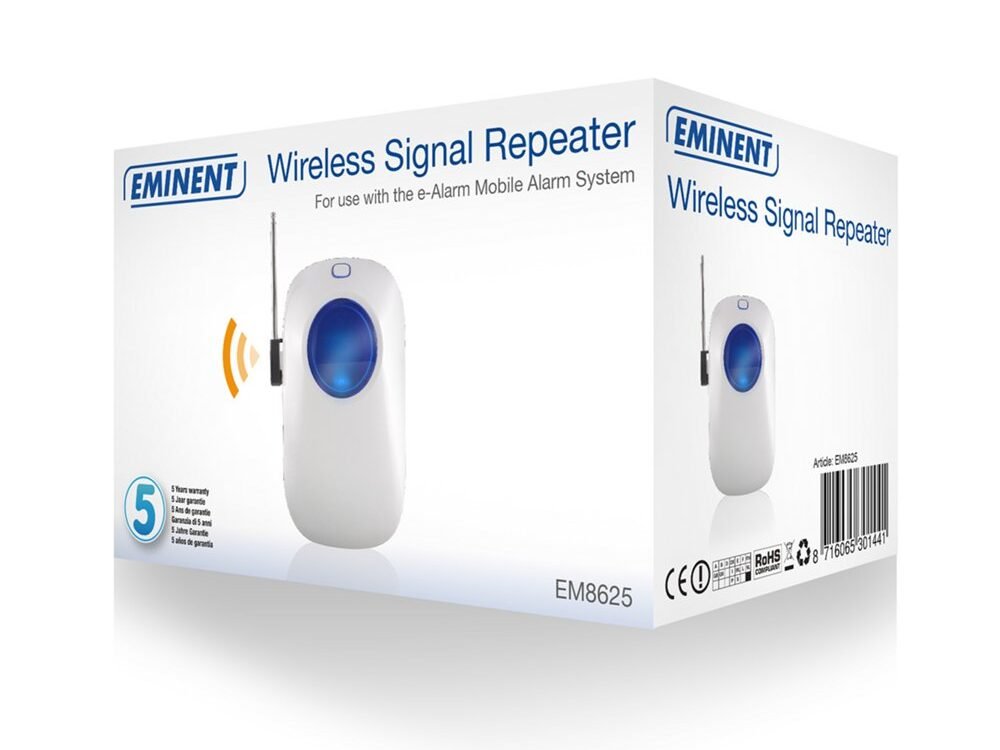 De EM8625 Wireless Repeater is geschikt voor het e-Alarm. Versterk het signaal en vergroot het bereik van de draadloze sensoren. Plaats de repeater maximaal 300 meter (open veld) van het bedieningspaneel. Plaats de accessoires maximaal 90 meter (open veld) van de Wireless Repeater.