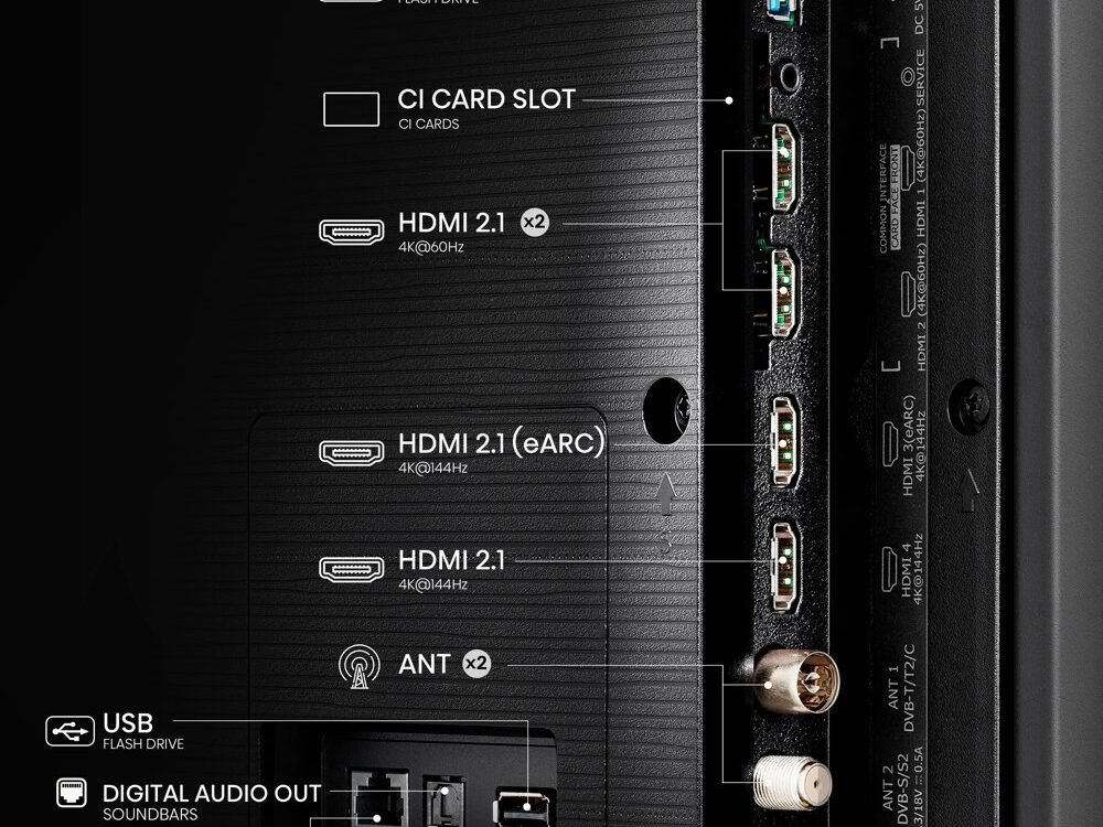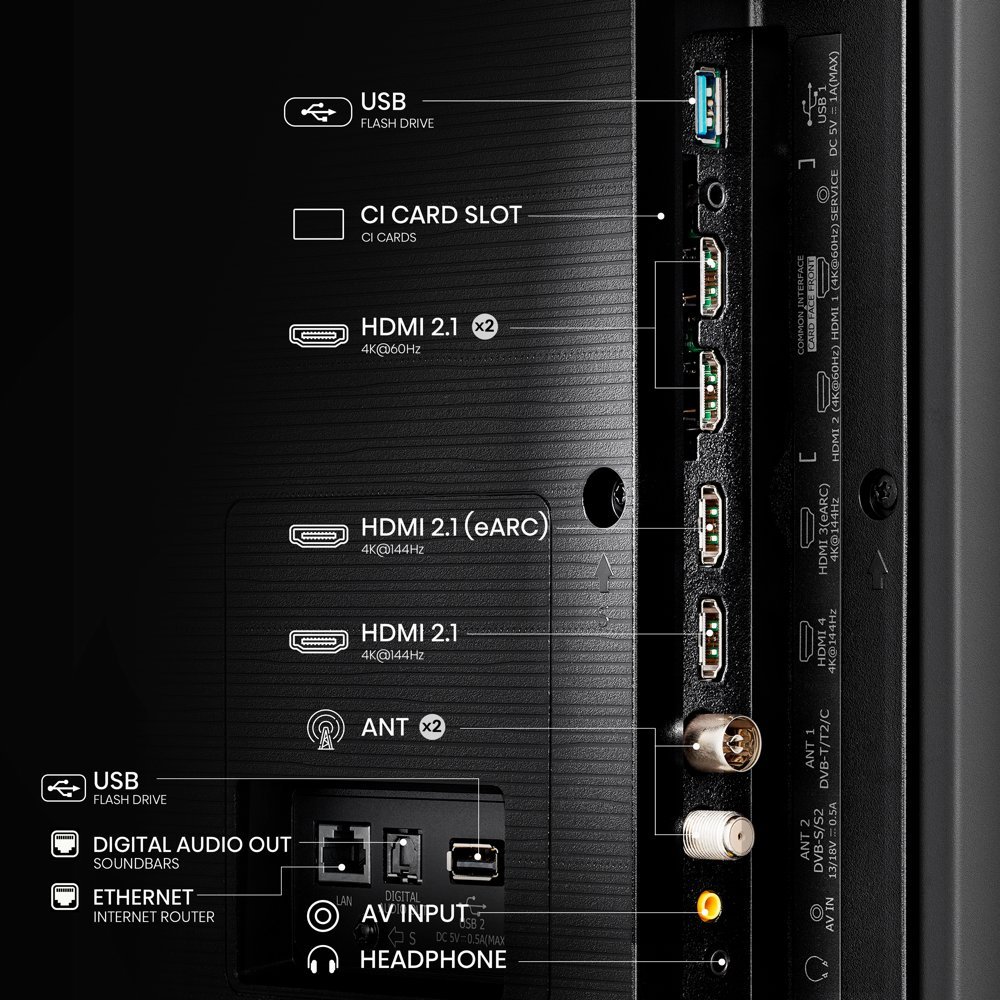 Met meerdere HDMI- en USB-poorten kun je eenvoudig externe apparaten zoals spelconsoles, soundbars en mediaspelers aansluiten. Dankzij Wi-Fi en Ethernet LAN blijft je TV altijd verbonden met het internet voor naadloze streaming en online entertainment.