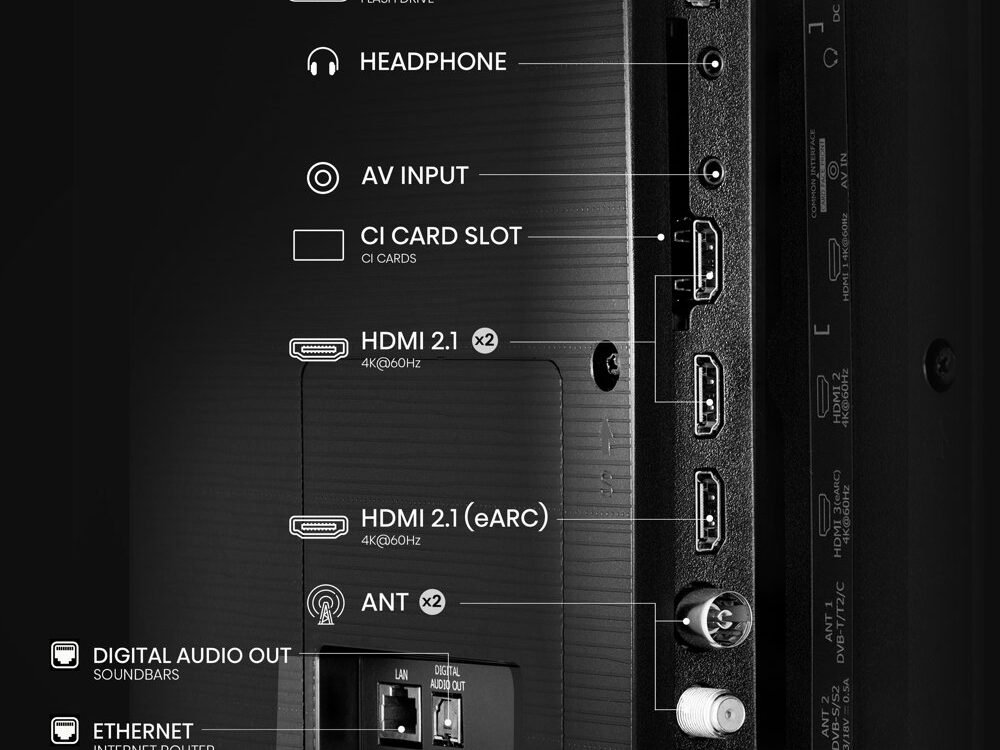 De Hisense 75E7NQ biedt veelzijdige connectiviteitsopties met drie HDMI 2.0-poorten, twee USB-aansluitingen, dual-band WiFi en Bluetooth. Zo sluit je moeiteloos al je apparaten aan of deel je media draadloos.