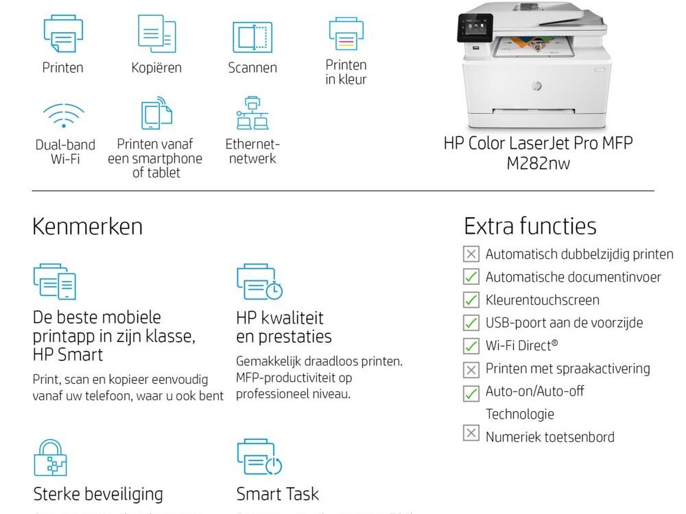 Deze betrouwbare MFP (multifunctionele printer) combineert krachtige kleurafdrukken met scan- en kopieerfuncties, allemaal binnen een gebruiksvriendelijke interface. Of je nu professionele rapporten of levendige marketingmaterialen afdrukt, de HP Color LaserJet Pro M282nw verhoogt je productiviteit terwijl hij optimale beveiliging en connectiviteit biedt.