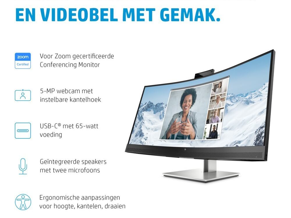 Alles wat je nodig hebt om met gemak te videobellen. Maak gemakkelijk verbinding en voer videogesprekken met de door Zoom gecertificeerde HP E34m G4 USB-C conferentiemonitor die beschikt over een geïntegreerde, kantelbare webcam van 5 MP, naar voren gerichte speakers en twee microfoons. Werk moeiteloos en houd je setup eenvoudig met één USB-C®-kabel voor data, video en tot 65 watt oplaadvermogen.