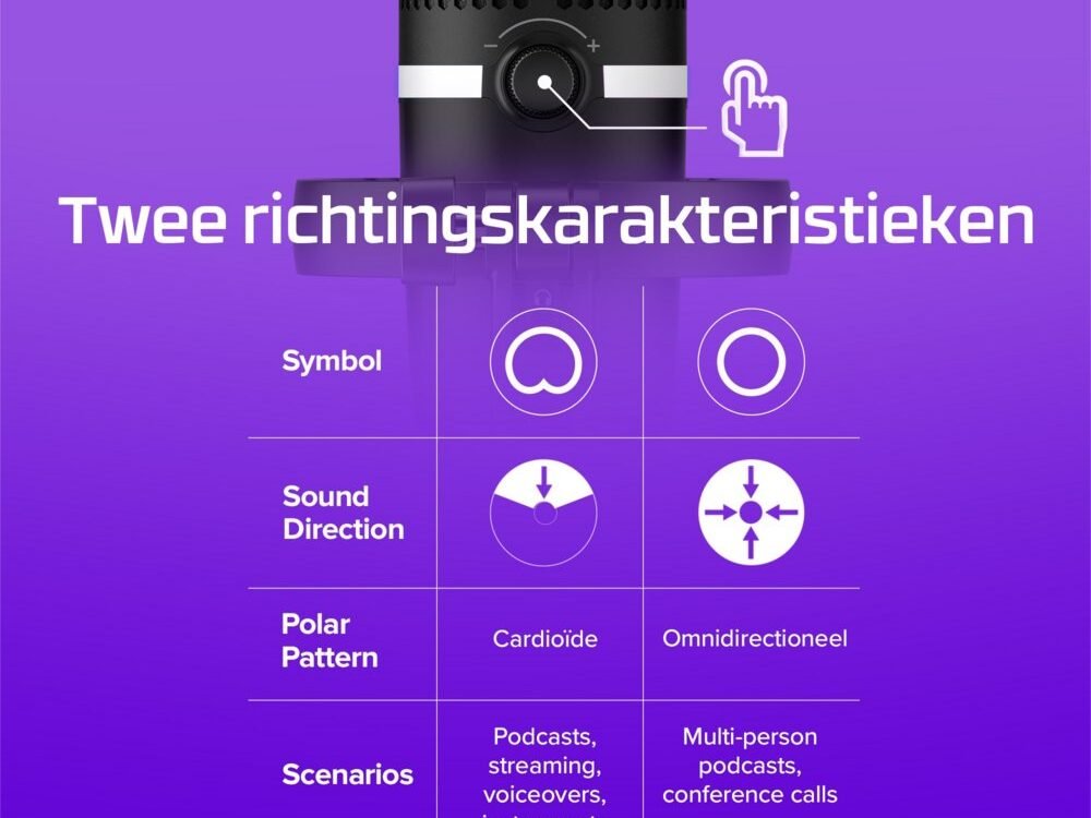 – Tikken om te dempen sensor en regelaar voor gain-aanpassing: Handige tikken om te dempen functie en een eenvoudig te gebruiken regelaar voor gain-aanpassing om de controle te houden over jouw uitzendgeluid.