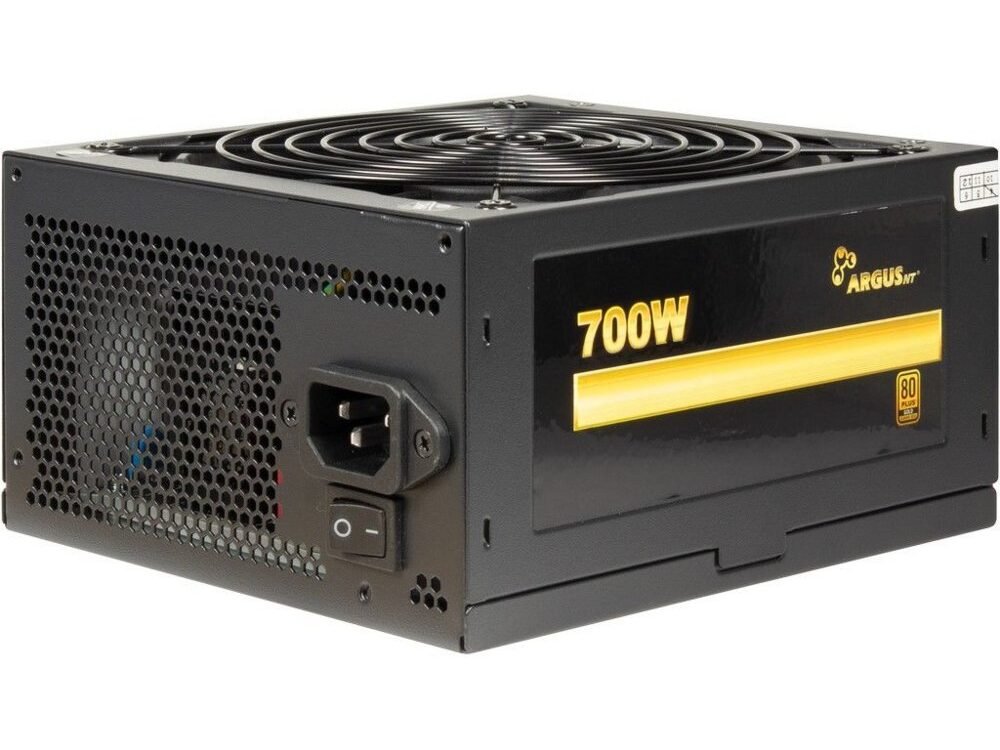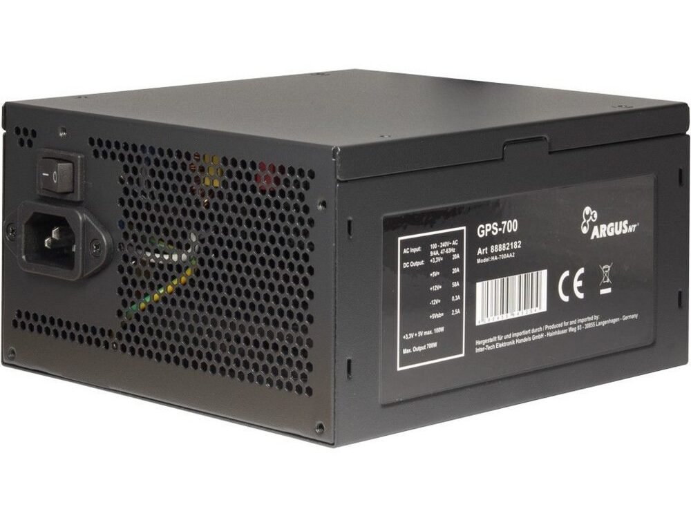 Inter-Tech ArgusNT GPS-700. Totaal vermogen: 700 W, AC-ingangsspanning: 100 – 240 V, AC-ingangsfrequentie: 47 – 63 Hz. Motherboard power connector: 20+4 pin ATX. Bedoeld voor: PC, Vormfactor van de voeding (PSU): ATX, 80 PLUS certificatie: 80 PLUS Gold. Kleur van het product: Zwart, Ventilator diameter: 14 cm, Aantal ventilatoren: 1 ventilator(en). Meegeleverde kabels: AC