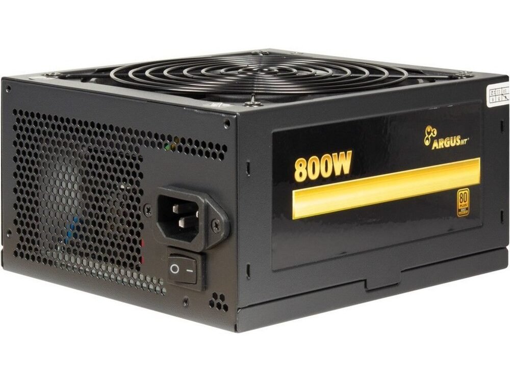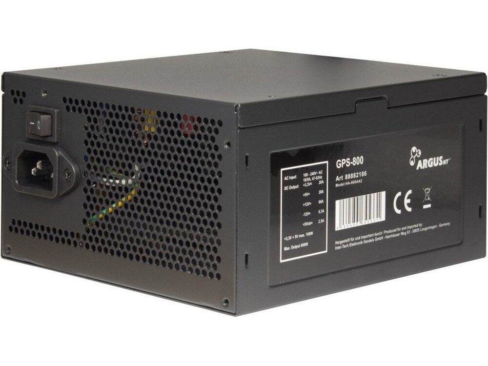 Inter-Tech ArgusNT GPS-800. Totaal vermogen: 800 W, AC-ingangsspanning: 100 – 240 V, AC-ingangsfrequentie: 47 – 63 Hz. Motherboard power connector: 20+4 pin ATX. Bedoeld voor: PC, Vormfactor van de voeding (PSU): ATX, 80 PLUS certificatie: 80 PLUS Gold. Kleur van het product: Zwart, Ventilator diameter: 14 cm, Aantal ventilatoren: 1 ventilator(en). Meegeleverde kabels: AC