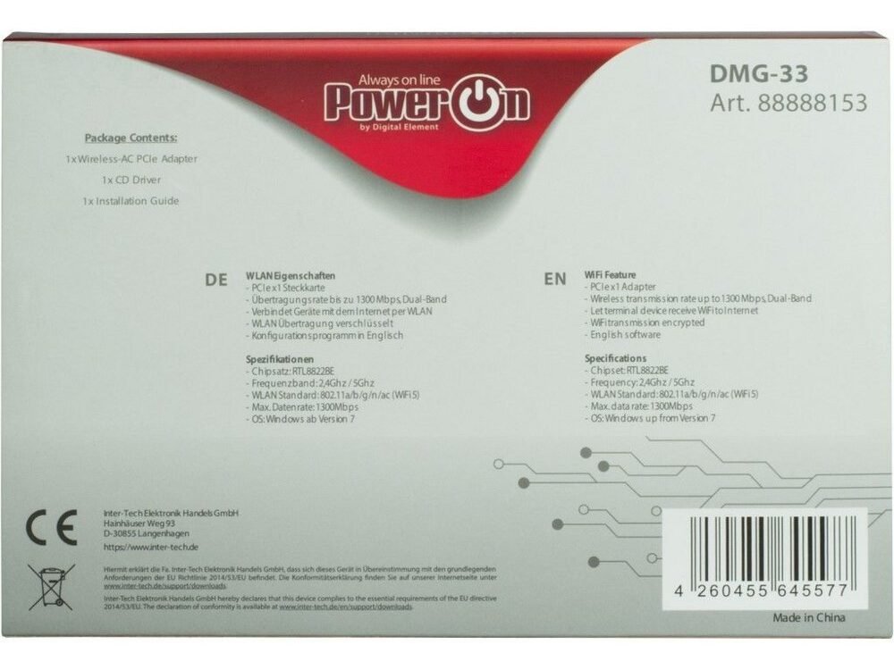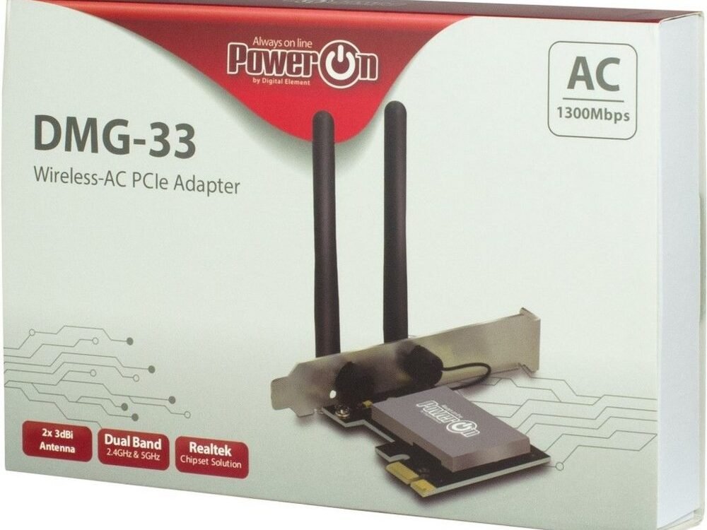 De DMG-33 verbindt desktops met een high-speed Wi-Fi netwerk. Hij is compatibel met de 802.11a/b/g/n/ac (WiFi 5) standaarden en haalt snelheden tot 1300Mbps in het 2,4GHz of 5GHz netwerk, via een vrije PCIe x1 poort.