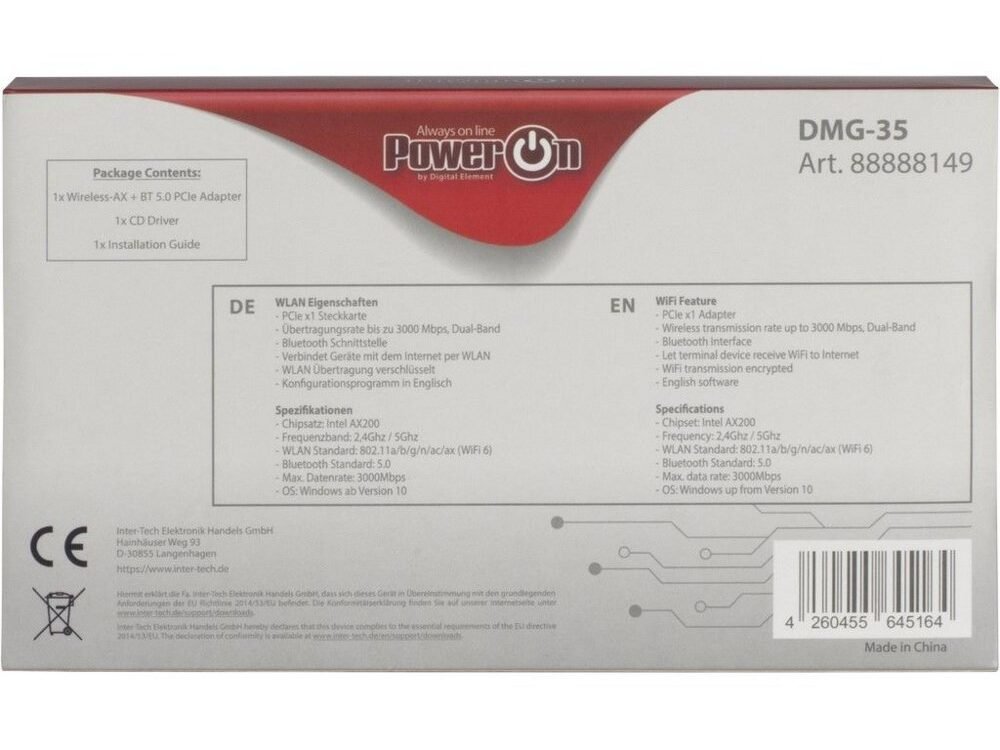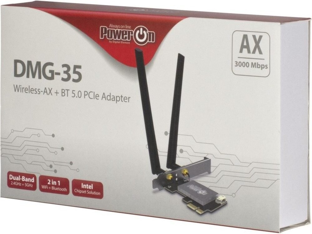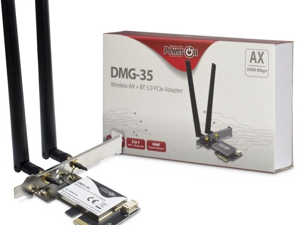 De DMG-35 is een 2in1 WLAN & Bluetooth 5.0 adapter. Hiermee kunt je jouw pc thuis of op kantoor aansluiten op het WLAN-netwerk. De WLAN (802.11 a/b/g/n/ac/ax) PCIe-adapter is uitgerust met een moderne Intel AX200 chipset en biedt snelheden tot 3000Mbps in het 2,4GHz of 5GHz netwerk, wat de ideale basis vormt voor snelle gegevensoverdracht.