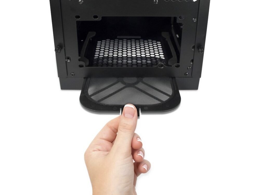 Het deksel van de behuizing heeft een groot stoffilter dat de binnenkant van de behuizing beschermt tegen stof. Het stoffilter wordt met twee eenvoudige klikken verwijderd en kan gemakkelijk en snel worden gereinigd.