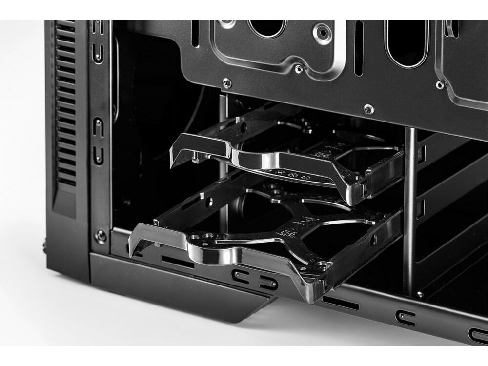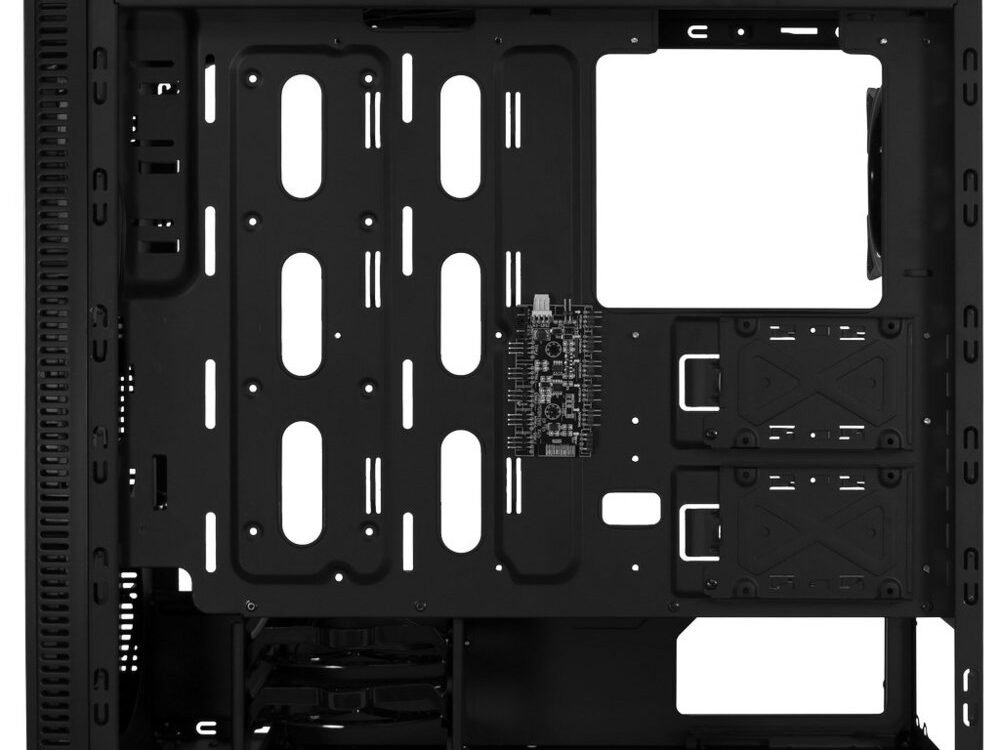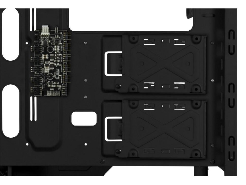 Achter de moederborddrager bevindt zich het hart van de X-908 Infini2 – het RGB/PWM-bord. Alle geïnstalleerde RGB-LED’s, zoals de RGB-LED’s van de ventilatoren, de RGB-LED’s van de balk boven de stroomverdeeltunnel of de RGB-LED’s van het Infinity-frontpaneel, worden synchroon aangestuurd via de printplaat. Bovendien kunnen daar tot vijf 3-pins ventilatoren worden aangesloten, die allemaal via de PWM-aansluiting van het moederbord op snelheid kunnen worden geregeld. Twee installatiesleuven voor 2,5″ SSD’s bevinden zich aan de achterkant van de moederborddrager.