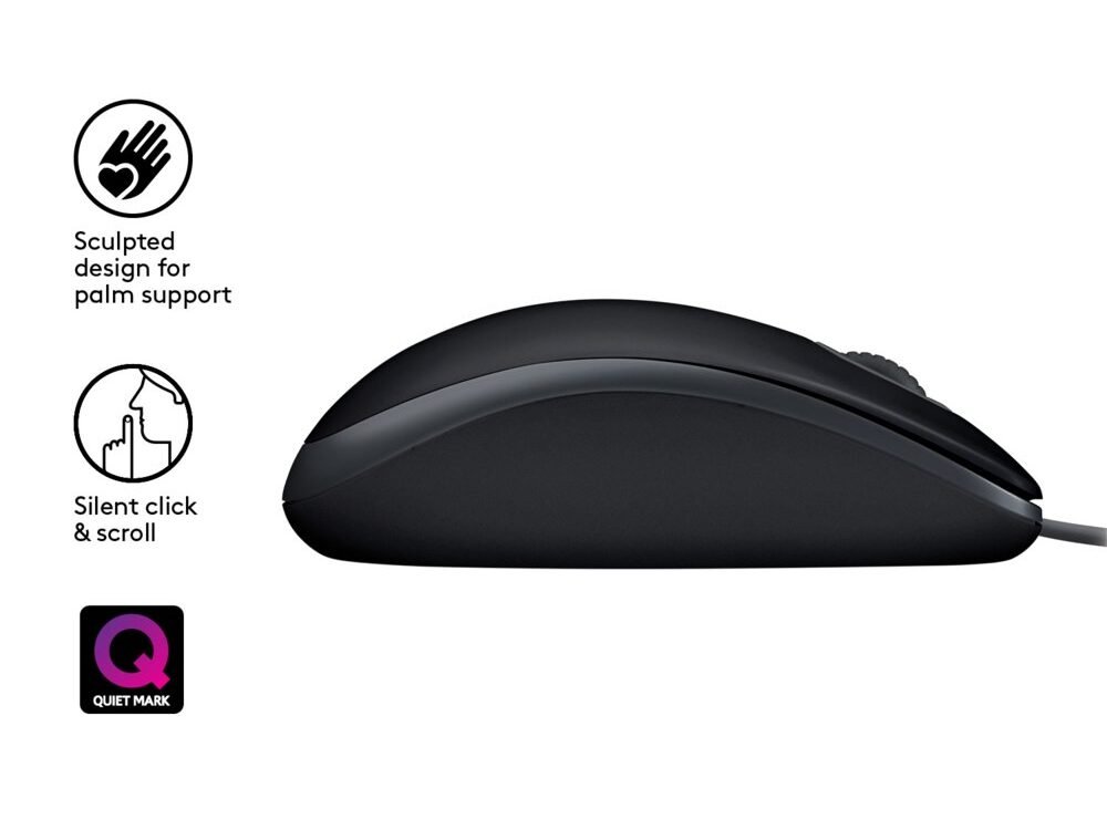 Muisstil. De Logitech B110 Silent biedt het gemak van plug-and-play, betrouwbaarheid en stille bediening van elke computer. Geniet samen met de omgeving van een geruisloze ervaring dankzij een 90% stillere muis met hetzelfde klikgevoel. De responsieve, soepele cursorbesturing biedt nauwkeurige tracking en eenvoudige tekstselectie, en dankzij het symmetrische ontwerp ligt deze standaardformaat muis comfortabel in zowel de linker- als rechterhand. Voor deze gebruiksvriendelijke, gemakkelijk in te stellen muis hoeft er geen software geinstalleerd worden. Sluit de kabel gewoon aan op een USB-poort en de muis is klaar voor gebruik.