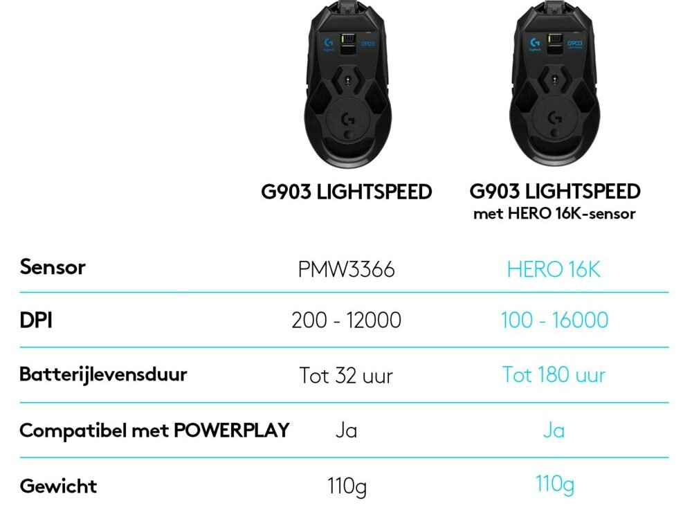 De Logitech G903 draadloze muis is voorzien van de volgende generatie 25K HERO-sensor. Deze kan bewegingen volgen met een nauwkeurigheid van minder dan een miljoenste van een meter, biedt 1:1 tracking, meer dan 400 IPS, 25.600 DPI, en dat alles zonder afvlakking, filtering of versnelling. LIGHTSPEED draadloze technologie levert een reactietijd van milliseconden zonder afbreuk te doen aan gewicht, levensduur van de batterij of latentie. De HERO 25K-sensor zorgt ook voor een langere levensduur van de batterij, waardoor je tot 140 uur kunt gamen met LIGHTSYNC RGB aan en 180 uur zonder. LIGHTSYNC RGB reageert op de actie in de game met een spectrum van 16,8 miljoen kleuren. De geavanceerde knopspanning houdt de primaire knoppen links en rechts altijd klaar voor activering, voor heldere, zuivere klikken en supernauwkeurige bediening. Met de Logitech G HUB-software kunnen 7-11 knoppen worden geprogrammeerd voor links- en rechtshandig gebruik.
