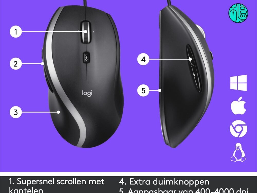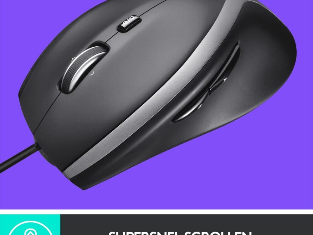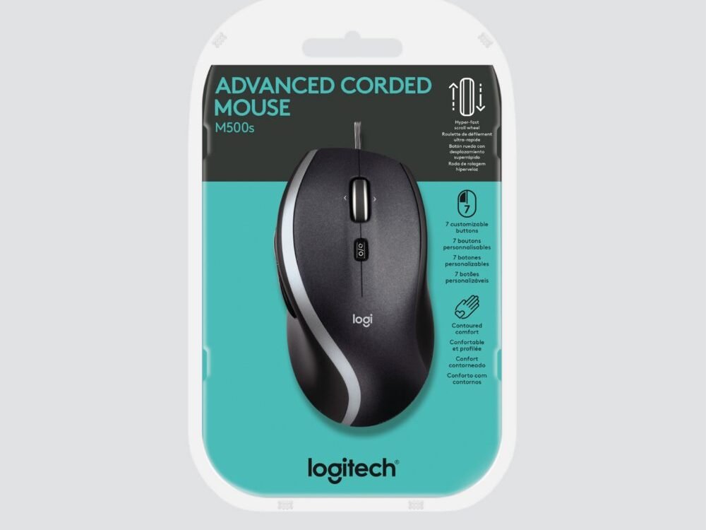 De Logitech® Advanced Corded Mouse M500s met supersnel scrollen voor hogere productiviteit. Met slechts één draai aan het soepele scrolwiel kun je door lange documenten en webpagina’s vliegen. Of schakel over op de kliksgewijze modus voor nauwkeurige regelnavigatie van lijsten, dia’s, afbeeldingen en menu’s. Nu met aanpasbare dpi van 400-4000 voor snelle en uiterst nauwkeurige cursorbesturing. Zachte zijkanten en een gerond ontwerp zorgen voor meer steun en controle. Dankzij de zeven aanpasbare knoppen kun je gemakkelijk door webpagina’s en fotoalbums navigeren. Plug-and-play-USB werkt direct uit de doos.