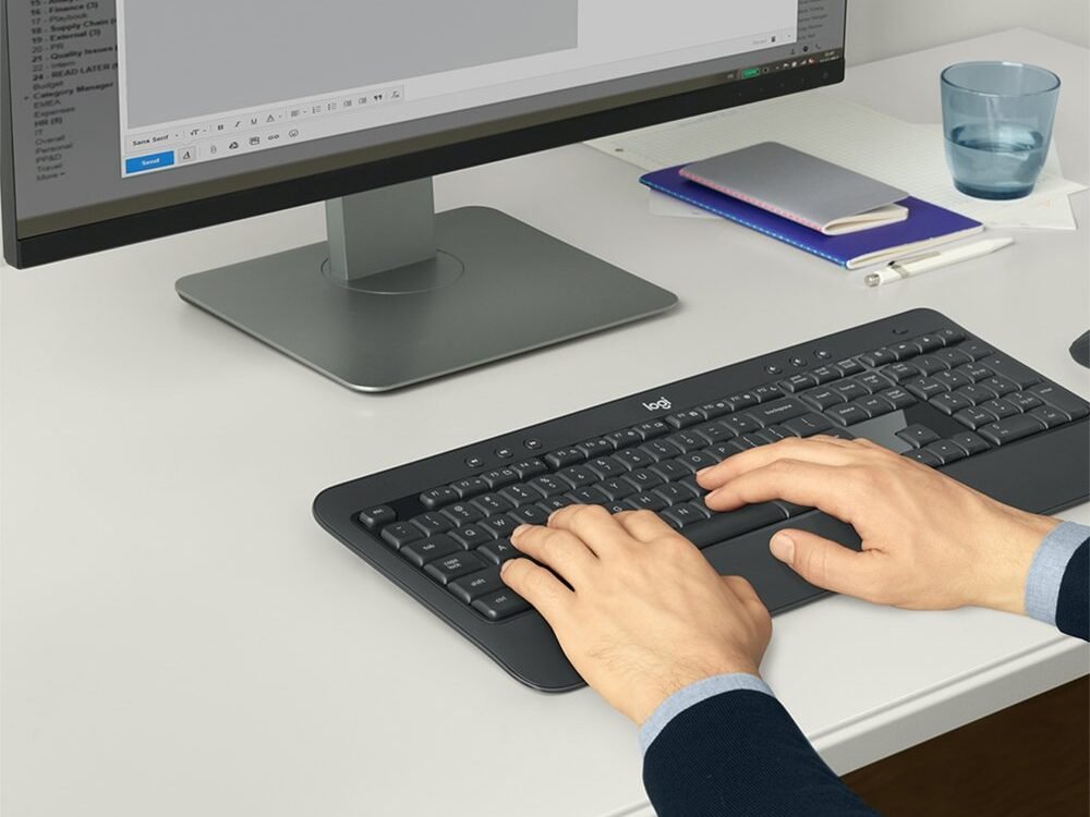 De toetsen zijn geoptimaliseerd voor meer nauwkeurigheid en een stillere toetsaanslag. Bovendien voelen het oppervlak en de toetsindeling meteen vertrouwd aan. Dankzij de handsteun en verstelbare voetjes profiteer je van langdurig comfort achter je bureau.