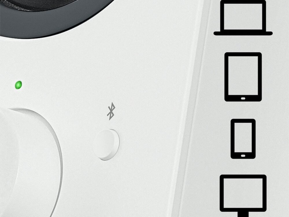 Op de rechterspeaker kun je via de knop voor Bluetooth-koppeling extra apparaten verbinden en de speakers bedienen. Er is ook een hoofdtelefoonaansluiting.