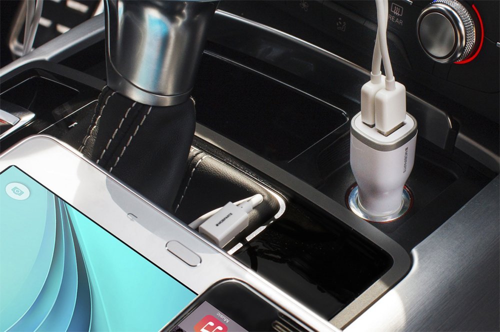 Krachtige 2.4A autolader met Smart IC en duo USB aansluiting.
