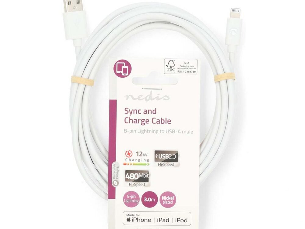 Nedis CCGL39300WT30. Snoerlengte: 3 m, Aansluiting 1: Lightning, Aansluiting 2: USB A. Vermogen: 12 W, Uitgangsstroom (max): 2,4 A. Diameter van de kabel: 4,2 mm. Aantal per verpakking: 1 stuk(s), Breedte verpakking: 25 mm, Diepte verpakking: 115 mm