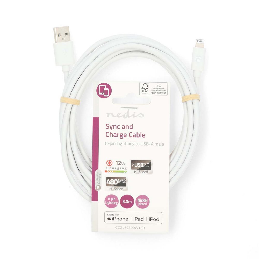 Nedis CCGL39300WT30 | Lightning-naar-USB-A kabel | 3 m | Lightning Male naar USB-A Male | Opladen en synchroniseren | Wit