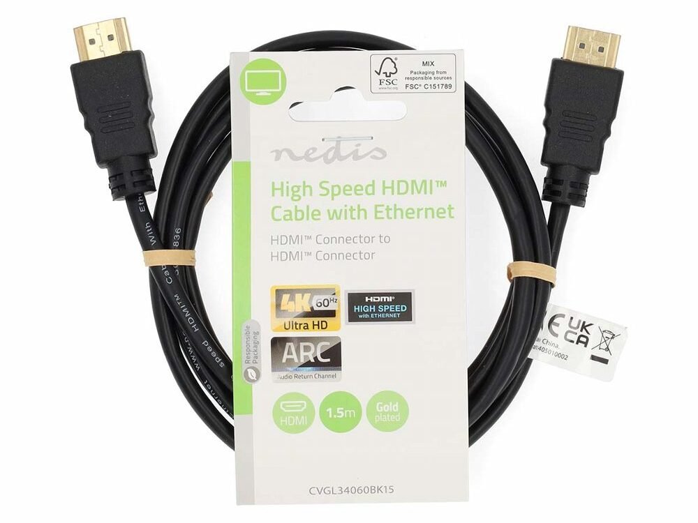 Nedis CVGL34060BK15. Snoerlengte: 1,5 m, Aansluiting 1: HDMI Type A (Standaard), Aansluiting 1 type: Mannelijk, Aansluiting 2: HDMI Type A (Standaard), Aansluiting 2 type: Mannelijk, Contact geleider materiaal: Goud, 3D, Overdrachtssnelheid: 18 Gbit/s, Audio Return Channel (ARC), Kleur van het product: Zwart