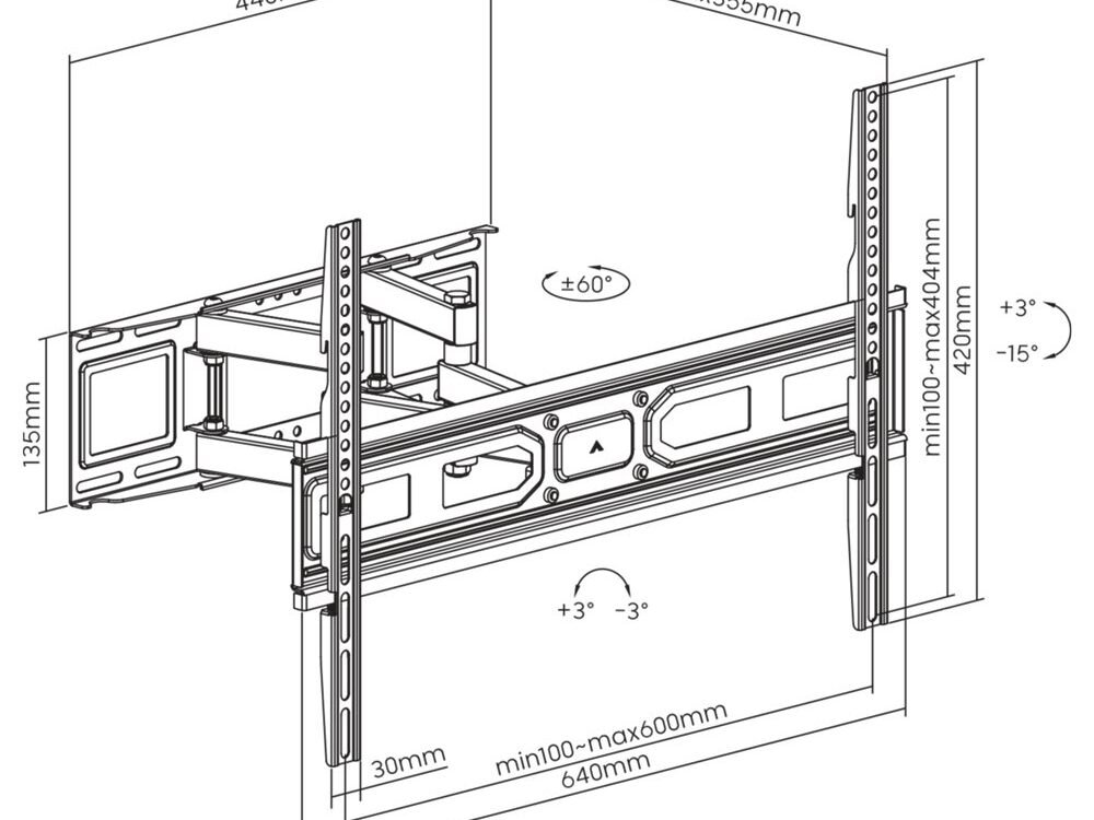 Deze beugel ondersteunt een breed scala aan VESA-montageformaten van 100×100 mm tot 600×400 mm, wat betekent dat hij compatibel is met vrijwel alle gangbare TV-modellen binnen dit formaat. Dankzij de draaibare en kantelbare functionaliteit kun je de kijkhoek eenvoudig aanpassen voor optimaal comfort, met een verticale kanteling van +3° tot −15° en een draaihoek van −60° tot +60° om reflecties en kijklijnen te optimaliseren.