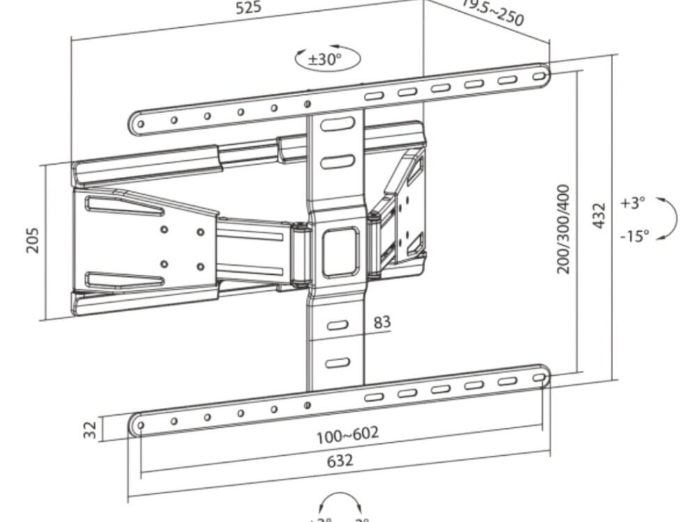 Met een minimale afstand tot de muur van 19,5 mm en een maximale uitschuiflengte van 250 mm biedt de beugel flexibiliteit in positionering. De kantelfunctie van +3° tot -15° en de draaifunctie van +30° tot -30° zorgen ervoor dat je altijd de optimale kijkhoek kunt instellen. Daarnaast is er een niveau-instelling van +3° tot -3° voor een perfecte uitlijning.