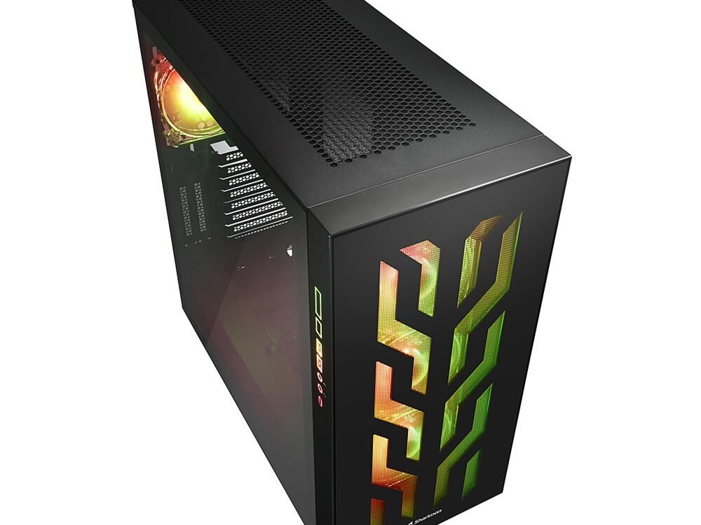 Een bijzonder detail van de CA300T bevindt zich op zijn al indrukwekkende voorkant. In plaats van het I/O-paneel bovenop de behuizing te plaatsen, zoals gebruikelijk is, heeft Sharkoon het aan de zijkant geplaatst. Knoppen en aansluitingen zijn nu bijzonder gemakkelijk te bereiken wanneer de behuizing op een tafel staat. Naast de gebruikelijke audio- en USB-poorten heeft de CA300T ook een USB Type C-poort. De finishing touch is dat het zijdelings geplaatste I/O-paneel zijn eigen RGB-verlichting heeft gekregen.