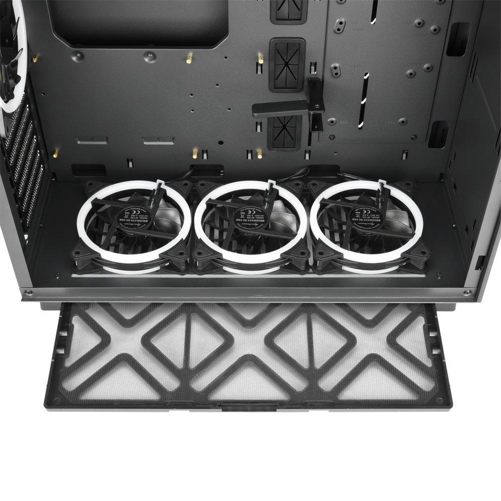 Op het onder- en bovenpaneel van de PURE STEEL RGB zijn in totaal vier 120mm-fans met adresseerbare leds voorgeïnstalleerd. Deze kunnen in 16,8 miljoen kleuren worden verlicht met een moederbord dat beschikt over headers voor adresseerbare leds (pintoewijzing 5V-D-coded-G of 5V-D-G). Voor incompatibele moederborden maakt de adresseerbare RGB-controller de verlichting van maximaal acht ledcomponenten in veertien lichteffecten mogelijk.