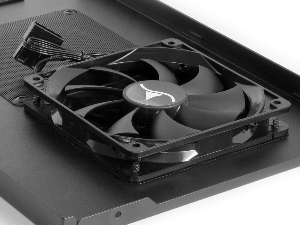 In de bovenzijde is al een stille 120-mm ventilator voorgeïnstalleerd, en optioneel kan er nog een extra 120-mm ventilator worden toegevoegd. Voor een optionele waterkoeling biedt de bovenzijde ook plaats aan een 240-mm radiator. Alle zijpanelen hebben ruime ventilatieopeningen en zijn allemaal voorzien van stoffilters. Dit is een duidelijk voordeel voor geïnstalleerde grafische kaarten, die via de zijopeningen uitstekend van verse lucht worden voorzien. Om de ventilatie verder te optimaliseren, kan aan de achterkant een 80-mm ventilator worden gemonteerd.