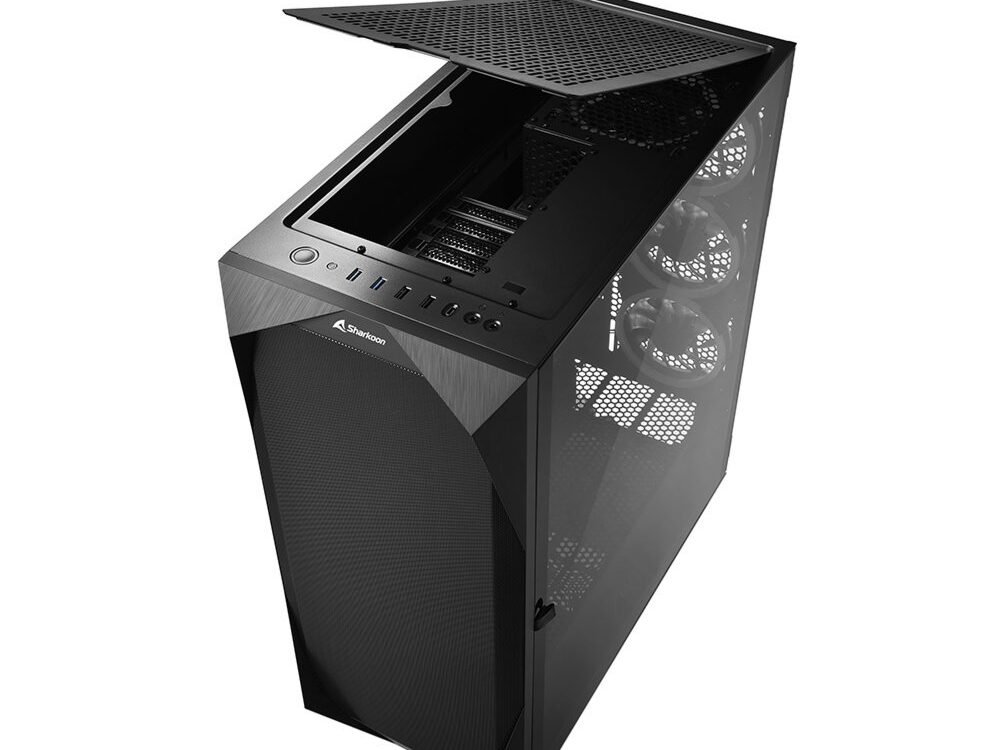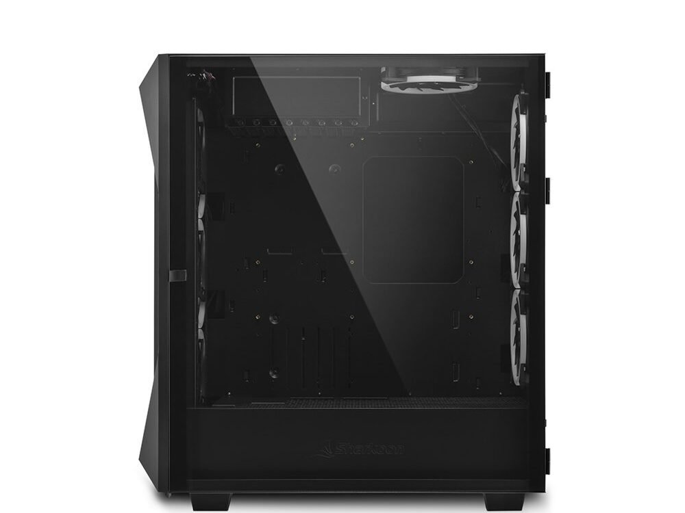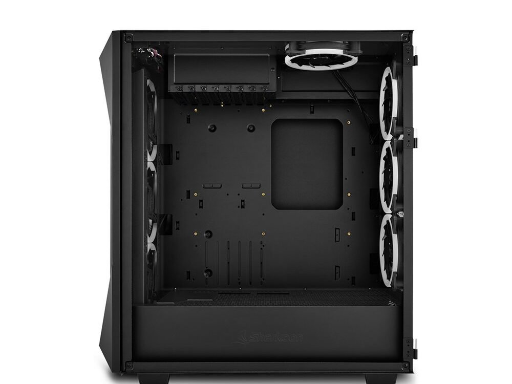 De REV300 biedt een diep inzicht in de binnenkant van de behuizing en de geïnstalleerde hardware componenten. Een gehard glazen zijpaneel aan de rechterkant maakt het mogelijk om het systeem volledig te tonen. Het zijpaneel rust handig op scharnieren aan de achterkant, waardoor het eenvoudig te openen en te sluiten is. Een magnetische sluiting zorgt ervoor dat alles veilig gesloten blijft. Samen met de verlichting van in totaal zeven RGB LED ventilatoren wordt de presentatie perfect gemaakt.