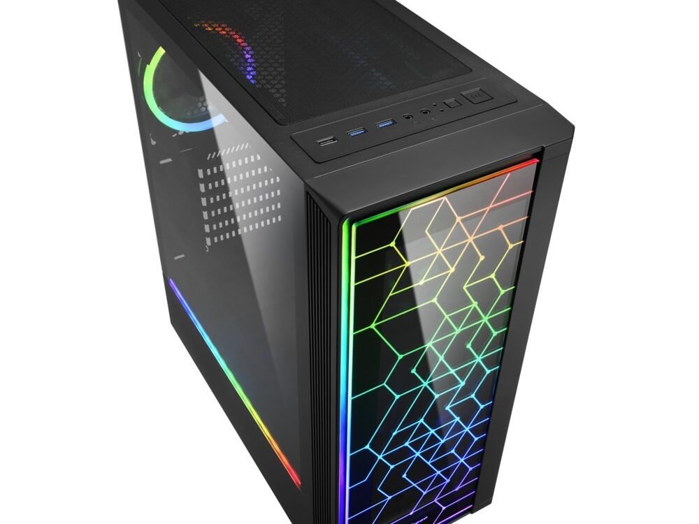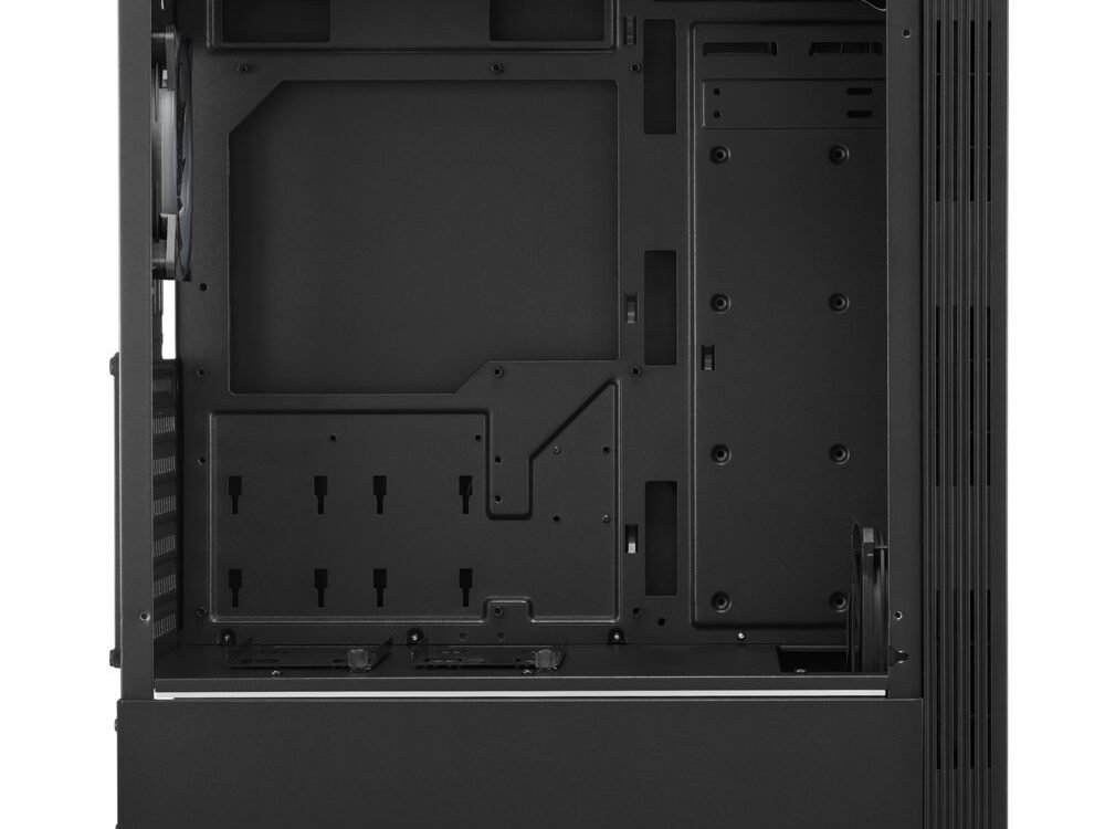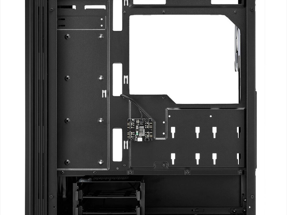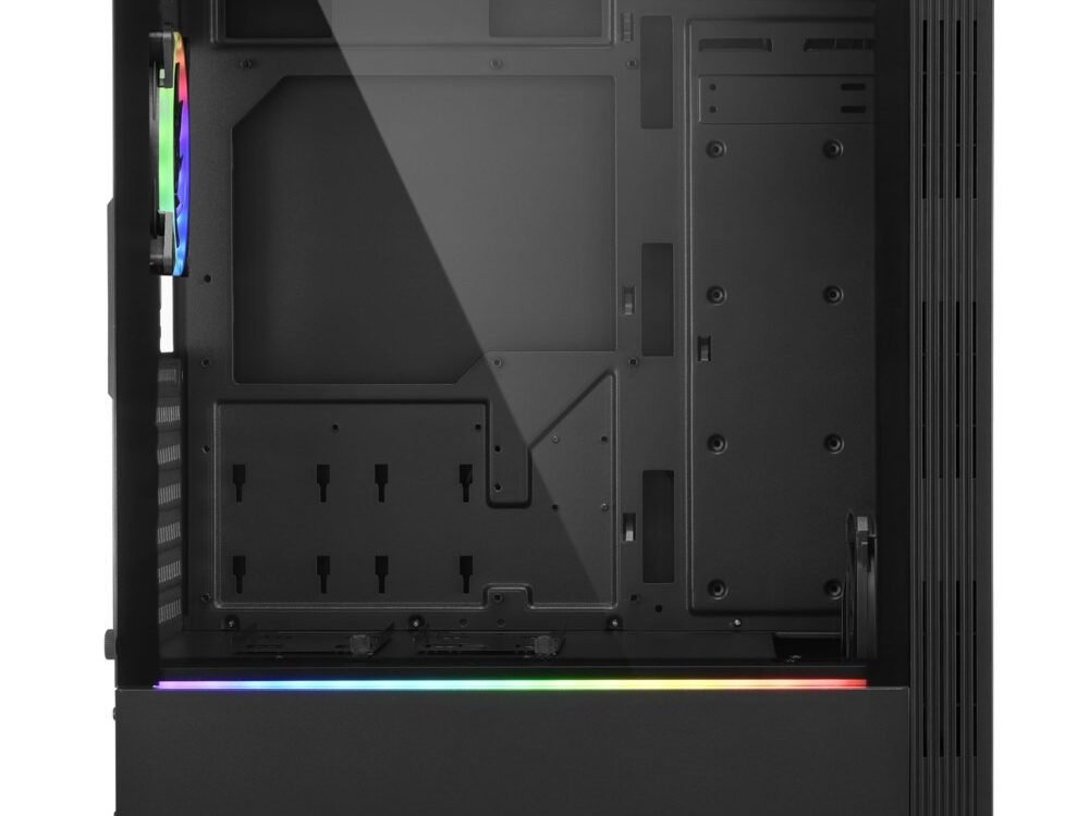 Effectieve verlichting van de hardware. Ook al mag de RGB LIT van buiten gezien worden, wat echt telt is wat aan de binnenkant zit. En juist dit is zeer goed te zien door het zijpaneel van gehard glas. Voor nog meer elegantie hebben we het zijpaneel zo ontworpen dat het aan de achterkant van de behuizing is bevestigd met nauwelijks zichtbare en gemakkelijk te verwijderen duimschroeven. Om ervoor te zorgen dat de verlichting van de hardwarecomponenten gelijk blijft aan de verlichting van het frontpaneel, is er onder het window van gehard glas een adresseerbare ledstrip bevestigd. Dit zorgt voor extra effecten en een volledige verlichting van de behuizing.
