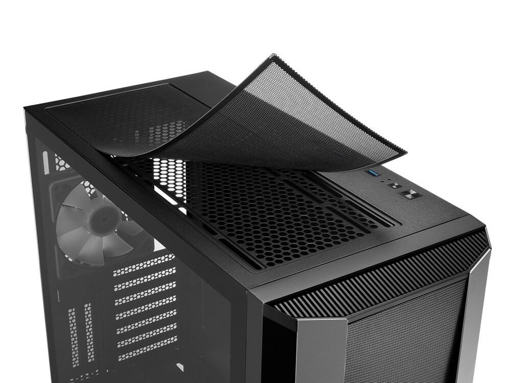 Toegevoegde Koelte. Naast de ventilatoren kan ook een radiator met een lengte tot 360 mm worden geïnstalleerd onder het bovenpaneel of achter het gaasfrontpaneel, wat zorgt voor voldoende waterkoeling. Afhankelijk van de grootte van het moederbord en de hoogte van het RAM-geheugen, kunnen de radiator en de ventilatoren onder het bovenpaneel een hoogte hebben van 5 cm tot 20 cm.
